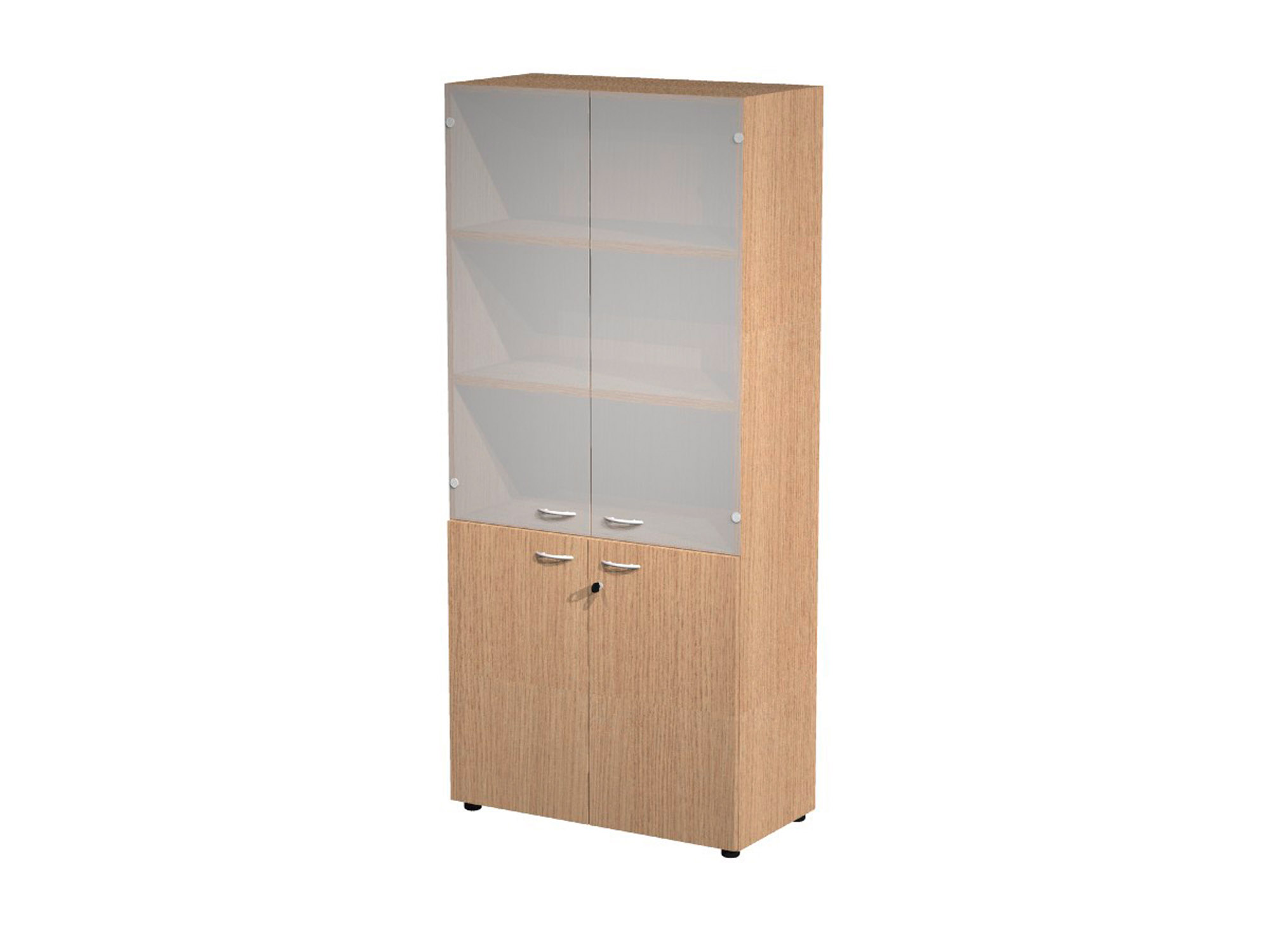 Altezza 200 cm. con ante superiori in vetro, ante inferiori in melaminico entrambe dotate di serratura e doppia chiave.