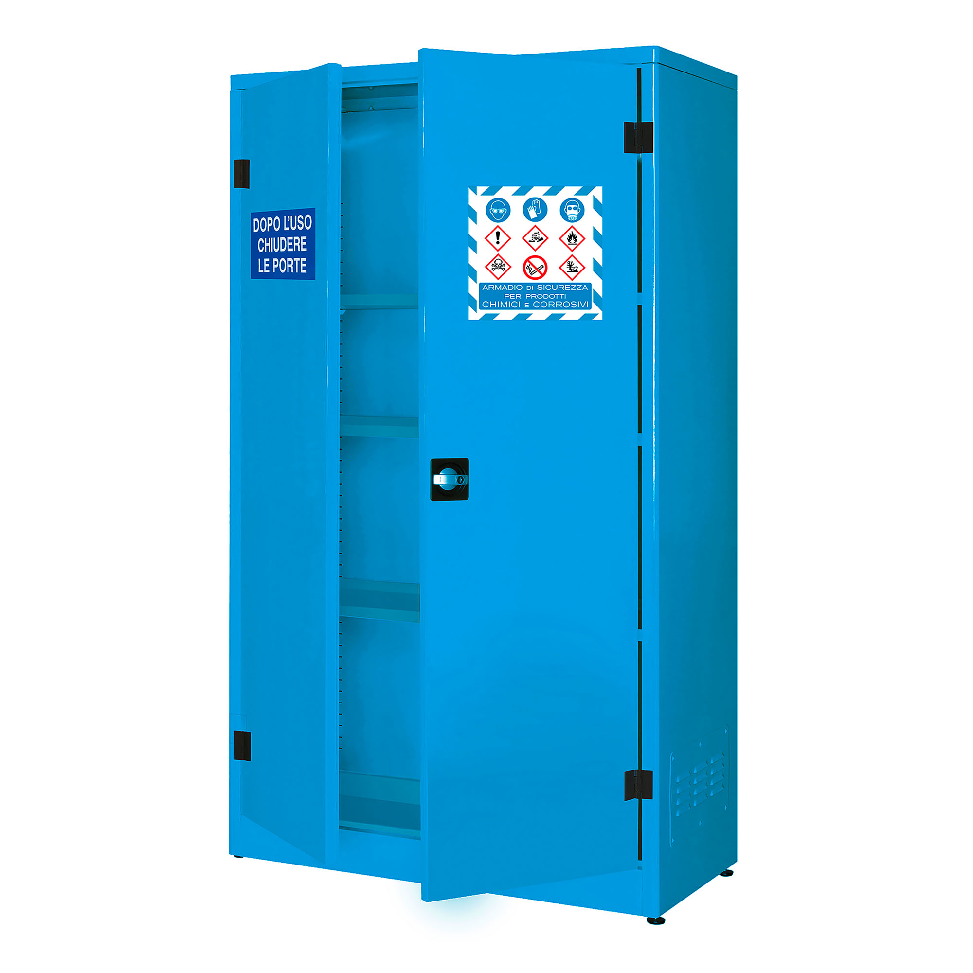 Armadio di sicurezza componibile per lo stoccaggio prodotti chimici realizzati in lamiera di acciaio al carbonio P02 spessore 10/10, pre-trattato con fosfosgrassaggio in tunnel ad alte temperature, verniciatura con innovativo e speciale materiale termoplastico a base polietilene che permette un rivestimento di alto spessore adatto alla resistenza agli agenti chimici corrosivi, BLU RAL5015, e cottura in galleria termica 180°.