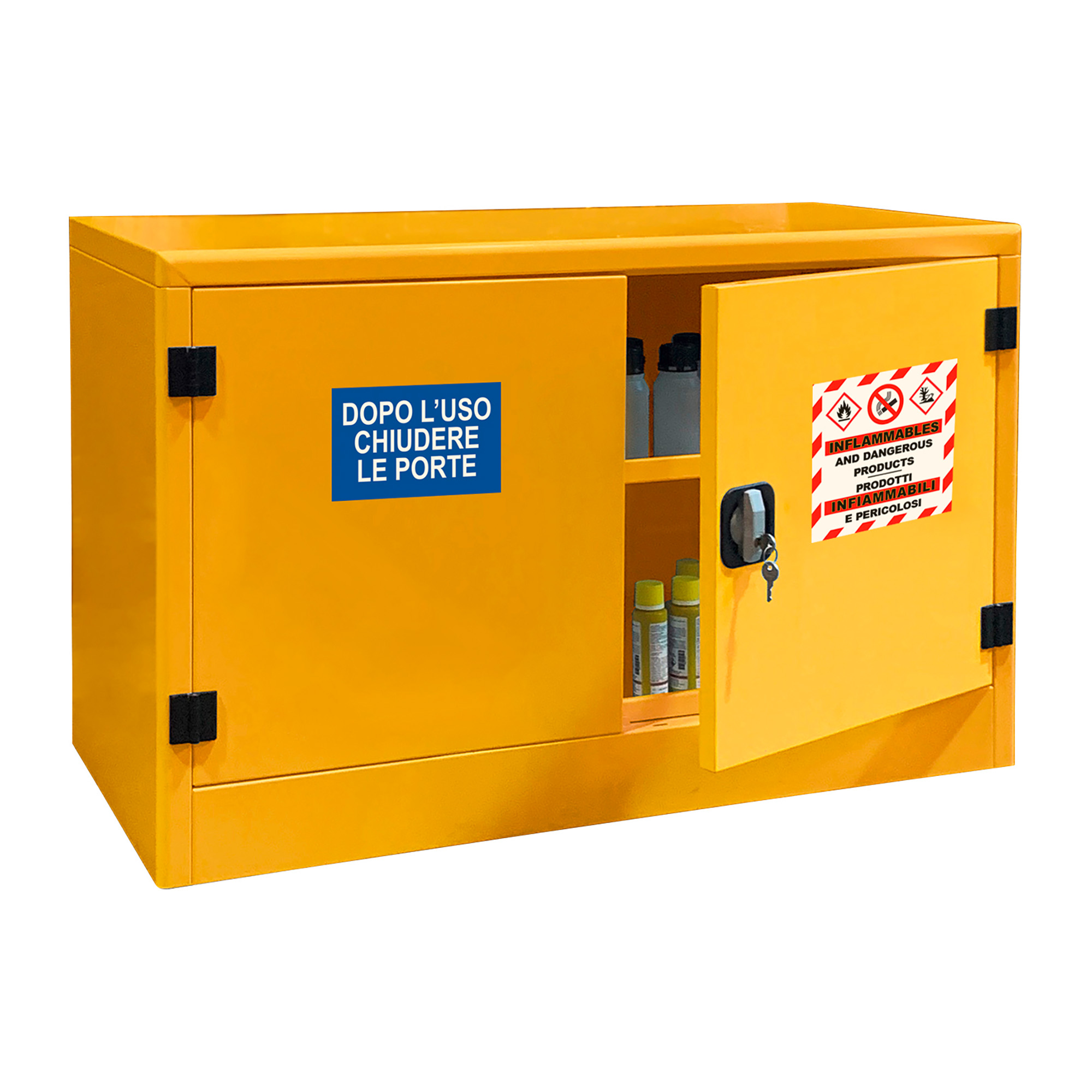 P02 spessore 10/10, pre-trattata con fosfosgrassaggio in tunnel ad alte temperature, verniciatura in epossipoliestere colore GIALLO RAL 1021 e cottura in galleria termica 180°. Dotati di ripiani di contenimento regolabili in altezza e vasca di raccolta a tenuta stagna sul fondo con guarnizioni in gomma, n. 2 griglie di areazione laterali con sistema tagliafiamma appositamente studiate per il ricircolo dell’aria o per l’aspirazione forzata. Spigolo arrotondato, robuste cerniere in zama spessore 6 mm, cavo di messa a terra, piedini regolabili, serratura ergonomica in plastica e alluminio con doppia chiave completa di chiusura ad asta con carter copri aste antimanomissione. I nostri armadi vengono forniti smontati in un robusto imballo su misura, posizionato su bancale singolo. Il montaggio è rapido e semplice, con manuale istruzioni contenuto in ogni kit. Costruito a regola d’arte in risposta alle normative vigenti in materia di protezione ambientale e prevenzione di inquinamento. Etichettatura di sicurezza come da disposizioni della normativa vigente.