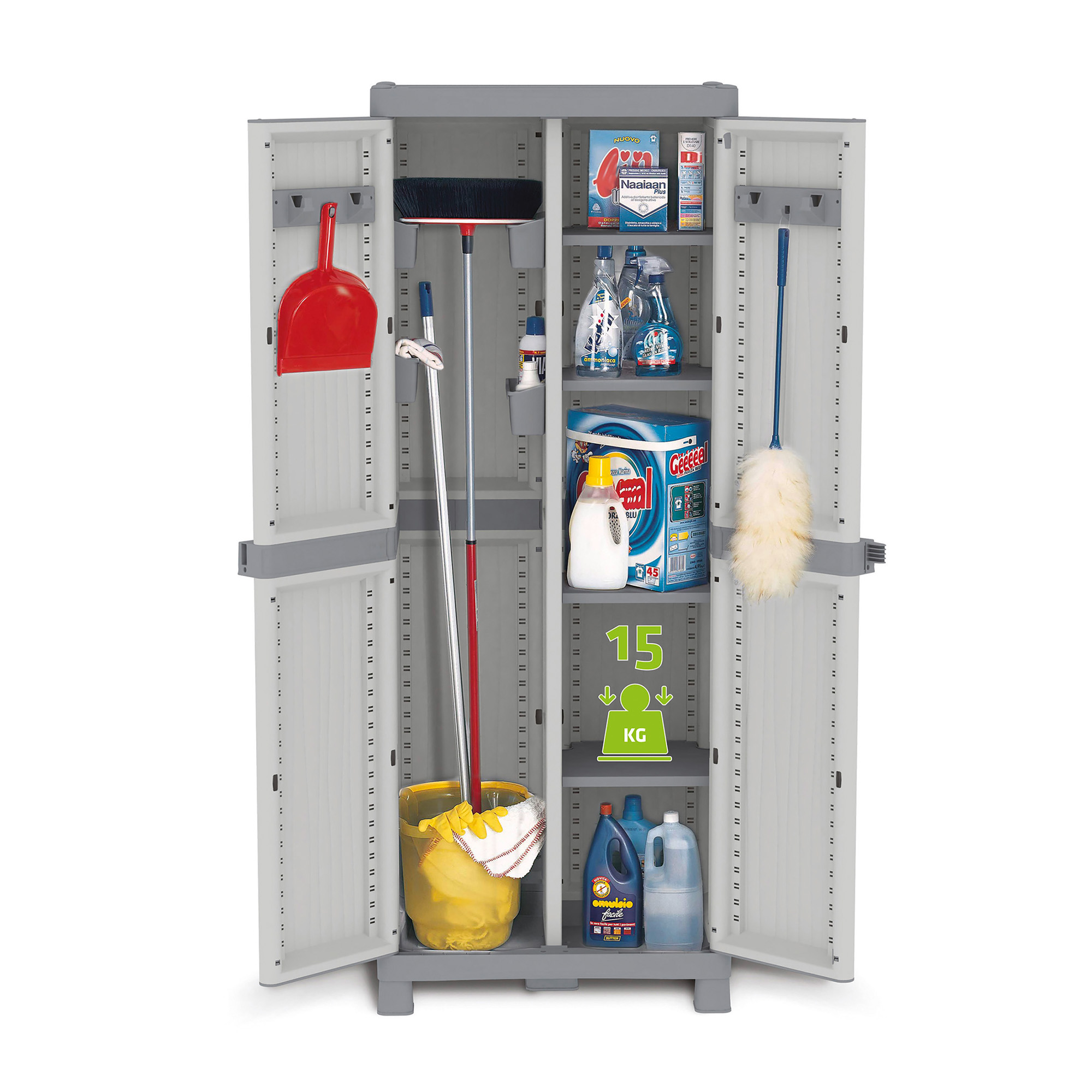 Dotato di ripiani interni regolabili, ante con predisposizione alla chiusura con lucchetto, piedini d’appoggio, accessori per il fissaggio alla parete.