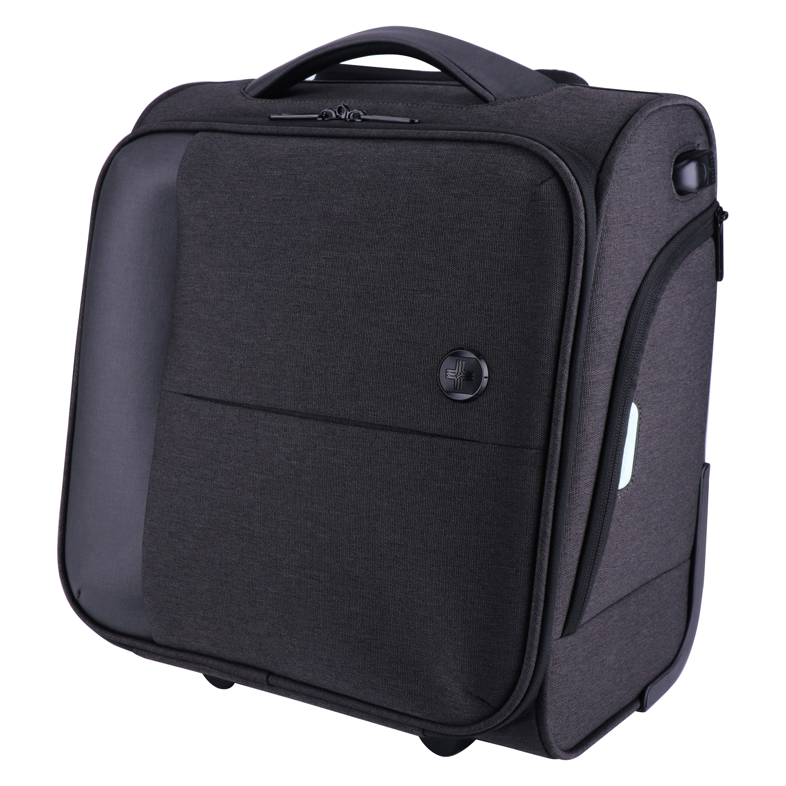 Caratteristiche • Prodotto con materiali robusti e durevoli • Elegante e compatto in colore grigio scuro con finiture in nero • Ideale per viaggiare entra perfettamente nello spazio sotto il sedile degli aerei o treni. • Interfaccia USB intelligente con cavo integrato per ricarica dispositivi • Tasca laterale portaoggetti e scomparto RFID interno per una maggiore protezione. • Pratico passante di fissaggio posteriore per eventuale trasporto su trolley più grande. • Ampio scomparto interno per abiti e oggetti con cinture di fissaggio. • Scomparto interno per laptop fino a 16‘’ • Tasca frontale porta documenti e porta Tablet • Apertura totale TSA friendly. • Pratica maniglia di trasporto • Ruote in nylon • Maniglia telescopica posteriore con chiusura a scomparsa