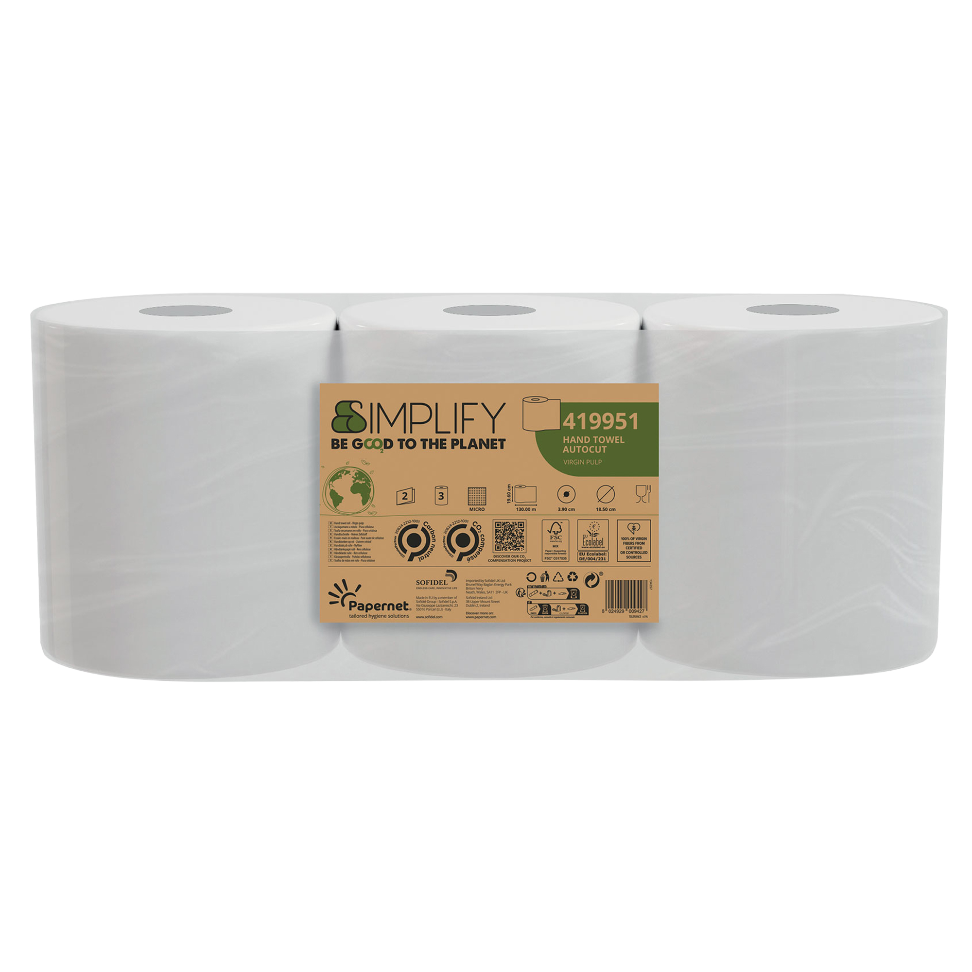 Asciugamani in rotolo Autocut (cod. 419951) a 2 veli e goffratura micro di colore bianco, con carta in pura cellulosa. Rispetta la certificazione EU Ecolabel. Compatibile con dispenser cod. 100641. Numero servizi: 1 Altezza servizio (cm): 19.6 Lunghezza servizio (cm): 13000 Lunghezza rotolo (m): 130 Diametro rotolo (cm): 18.5 Diametro anima (cm):3.9 Grammatura (g/m²): 19.5 Nuova gamma Simplify, la prima linea di prodotti Carbon Neutral nata con l’obiettivo di contribuire in maniera concreta e tangibile alla protezione globale del clima. Insieme a Climate Partner calcoliamo l’impronta ambientale dei prodotti Simplify nel loro intero ciclo di vita, andando a compensare le emissioni di CO2 prodotte sostenendo un progetto di protezione della foresta amazzonica a Labrea, in Brasile. Pack sostenibile realizzato in materiale termoretraibile riciclato.
