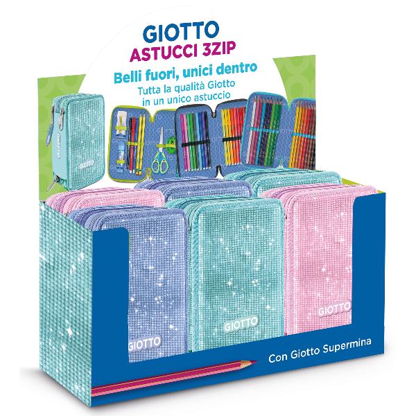 Questi astucci a tre scomparti sono spaziosi e contengono tutto il necessario per la scuola: colla Giotto Stick da 10g, righello Giotto da 15 cm, maxi gomma bianca Lyra Temagraph No-Sign, temperamatite Giotto con serbatoio, forbice, penne cancellabili Tratto Cancellik rosso e blu, penna sfera Tratto Uno Green Plastic nero, matite grafite Lyra Temagraph HB e 2B, 18 pennarelli Giotto Turbo Color e 18 pastelli Giotto Supermina con mina da 4 mm.