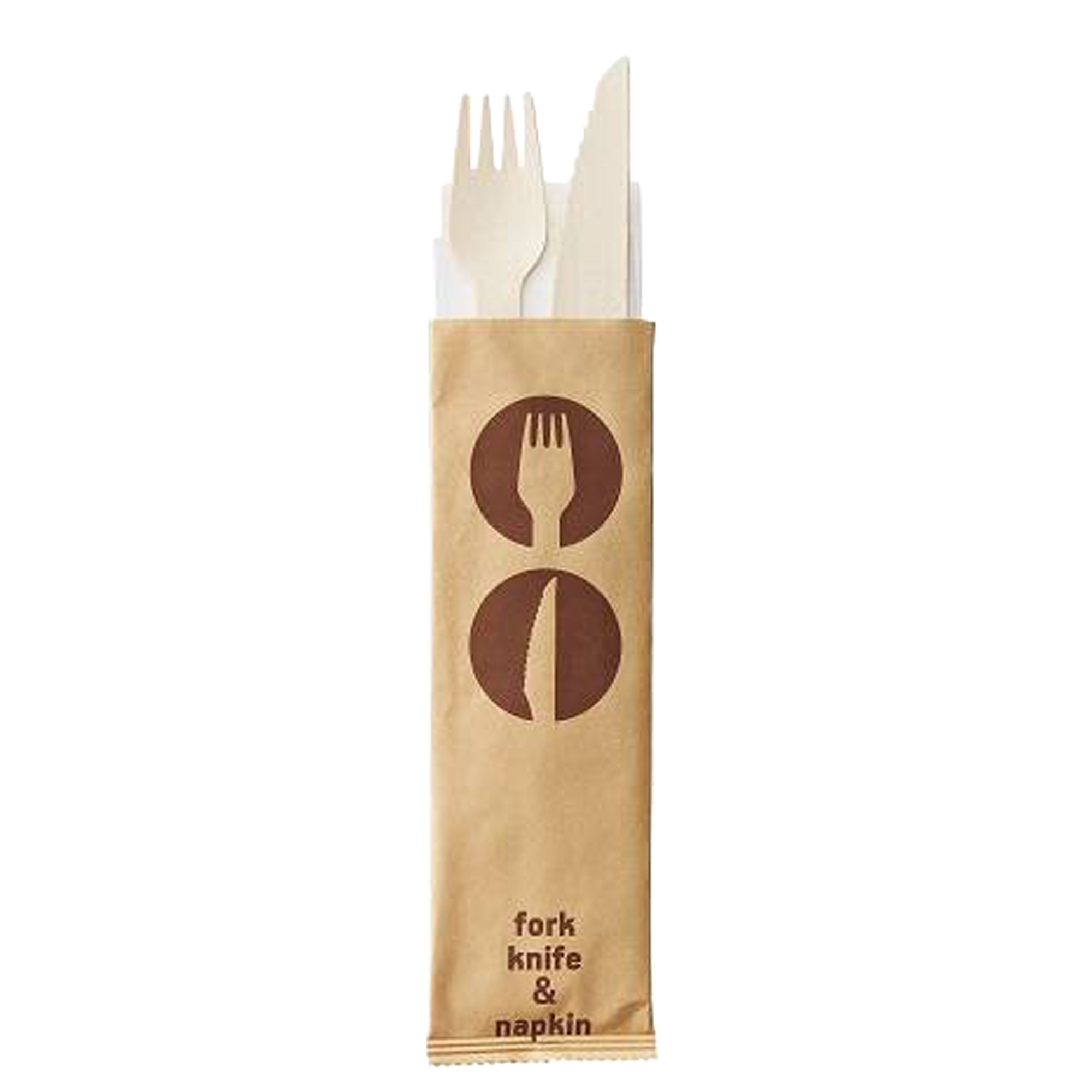 Bis coltello e forchetta - in legno - con tovagliolo - 16 cm - Leone - conf. 48 pezzi