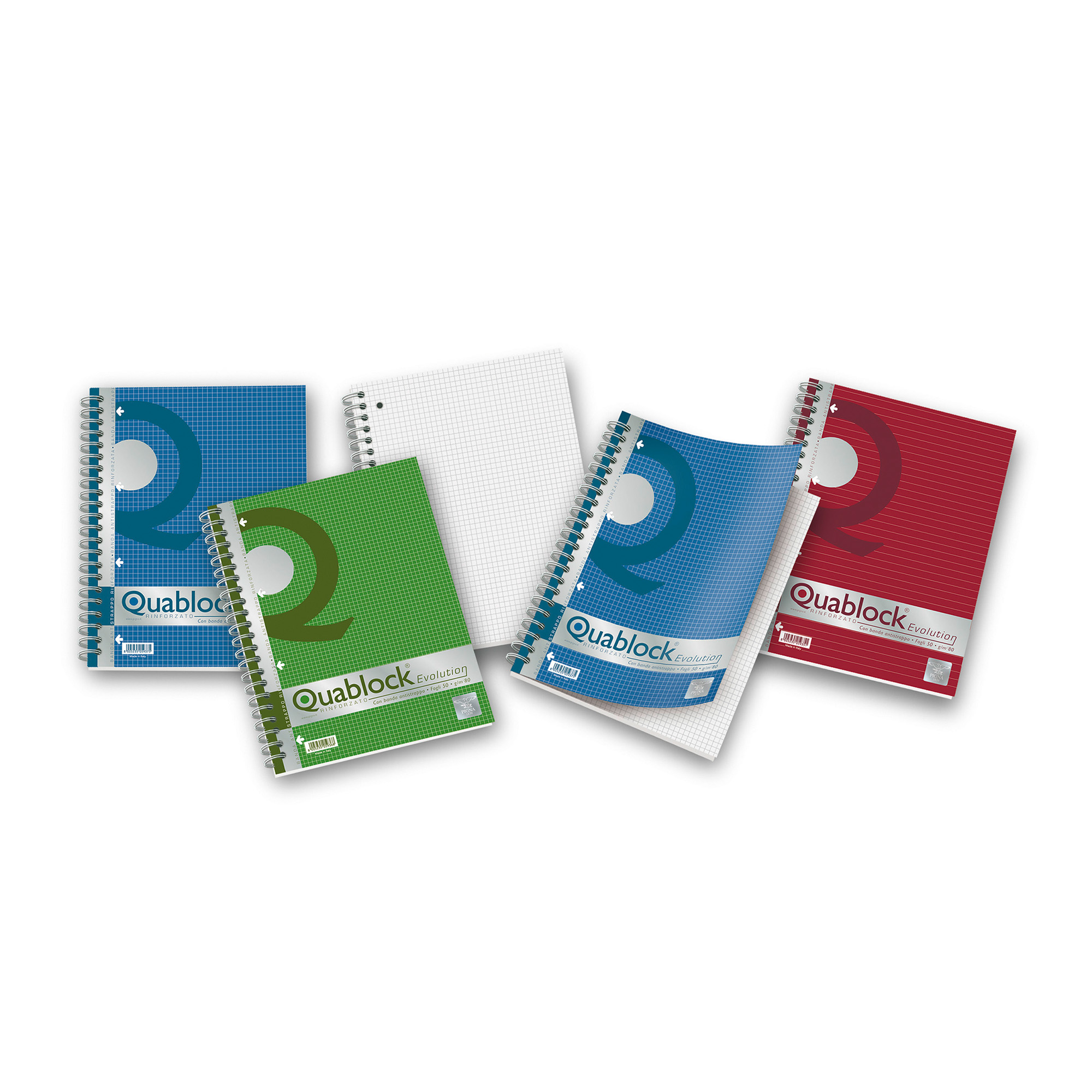 Blocco spiralato in formato A4 a 50 fogli rinforzati con microperforazione e fori.