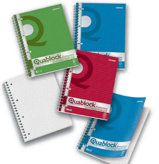 Descrizione dettagliata- la nuova linea con banda trasparente rinforzata antistrappo.- Blocco A4 Quablock Evolution Spiralato - 50 FF. 80 g/m2 rinforzati con microperforazione e fori.