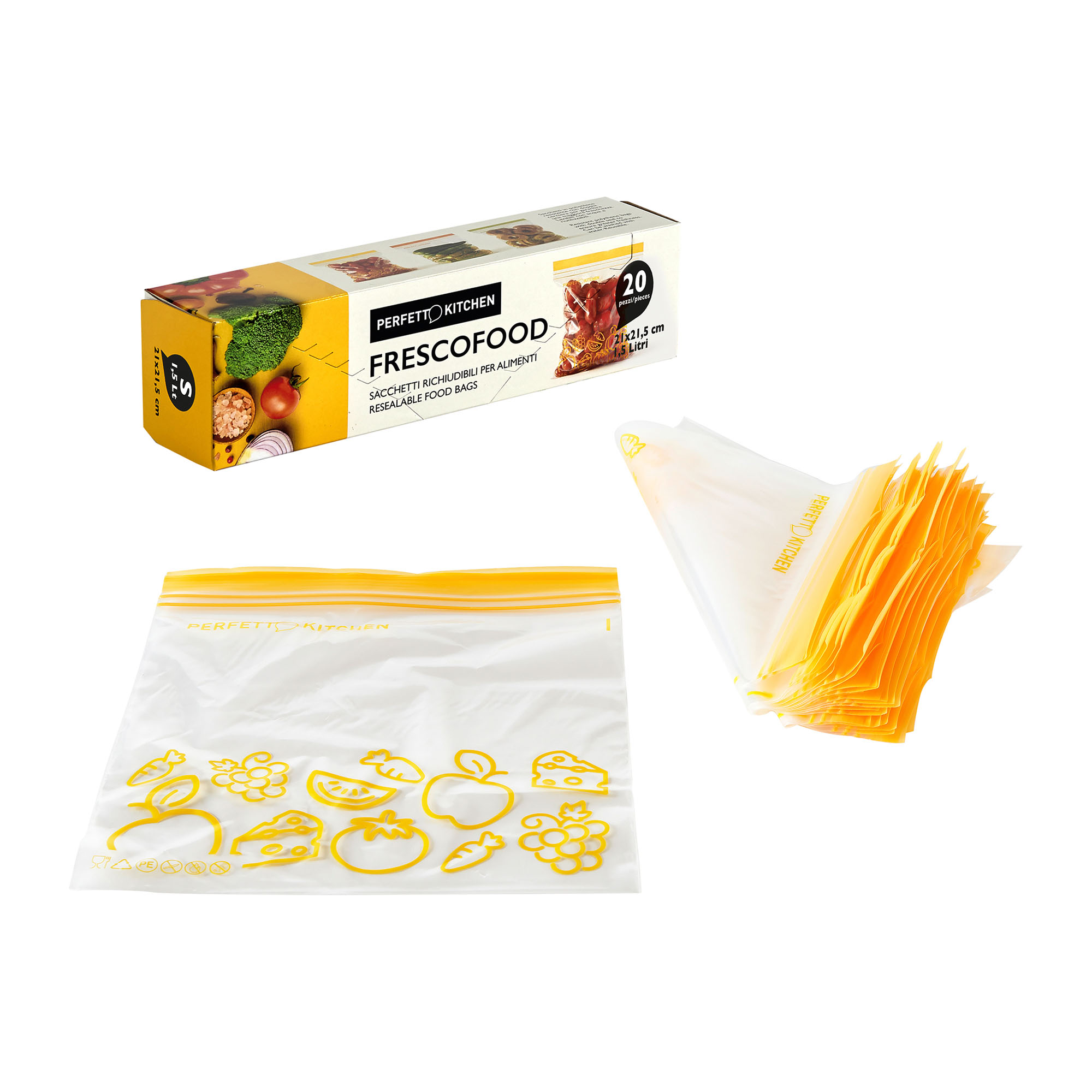 Sacchetti richiudibili per alimenti. Materiale in polietilene con doppia cerniera per garantire una maggior freschezza. Sono adatti per frigorifero e Freezer oppure in dispensa per alimenti secchi. Perfetti anche per contenere liquidi. Lavabili e riutilizzabili.