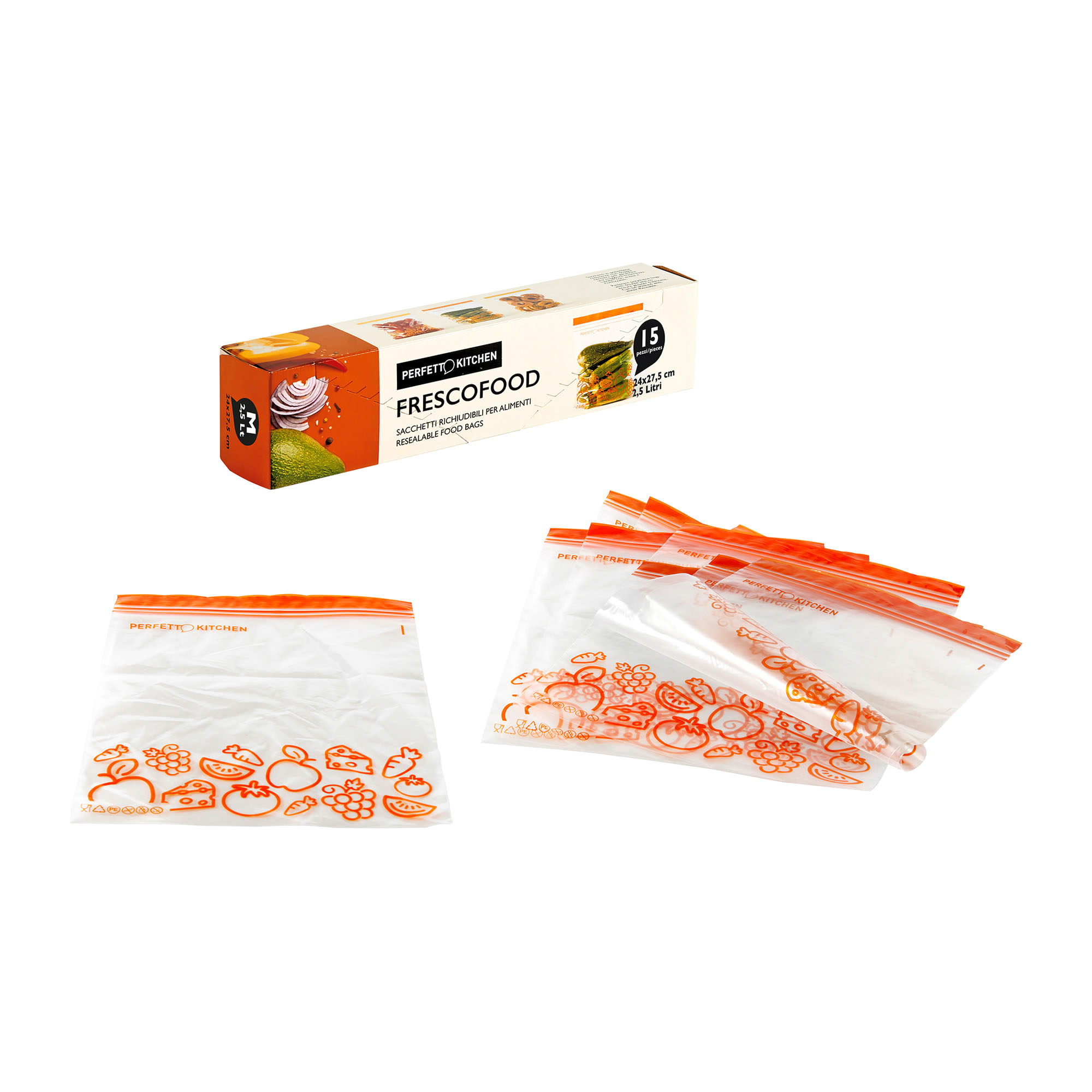 Sacchetti richiudibili per alimenti. Materiale in polietilene con doppia cerniera per garantire una maggior freschezza. Sono adatti per frigorifero e Freezer oppure in dispensa per alimenti secchi. Perfetti anche per contenere liquidi. Lavabili e riutilizzabili.