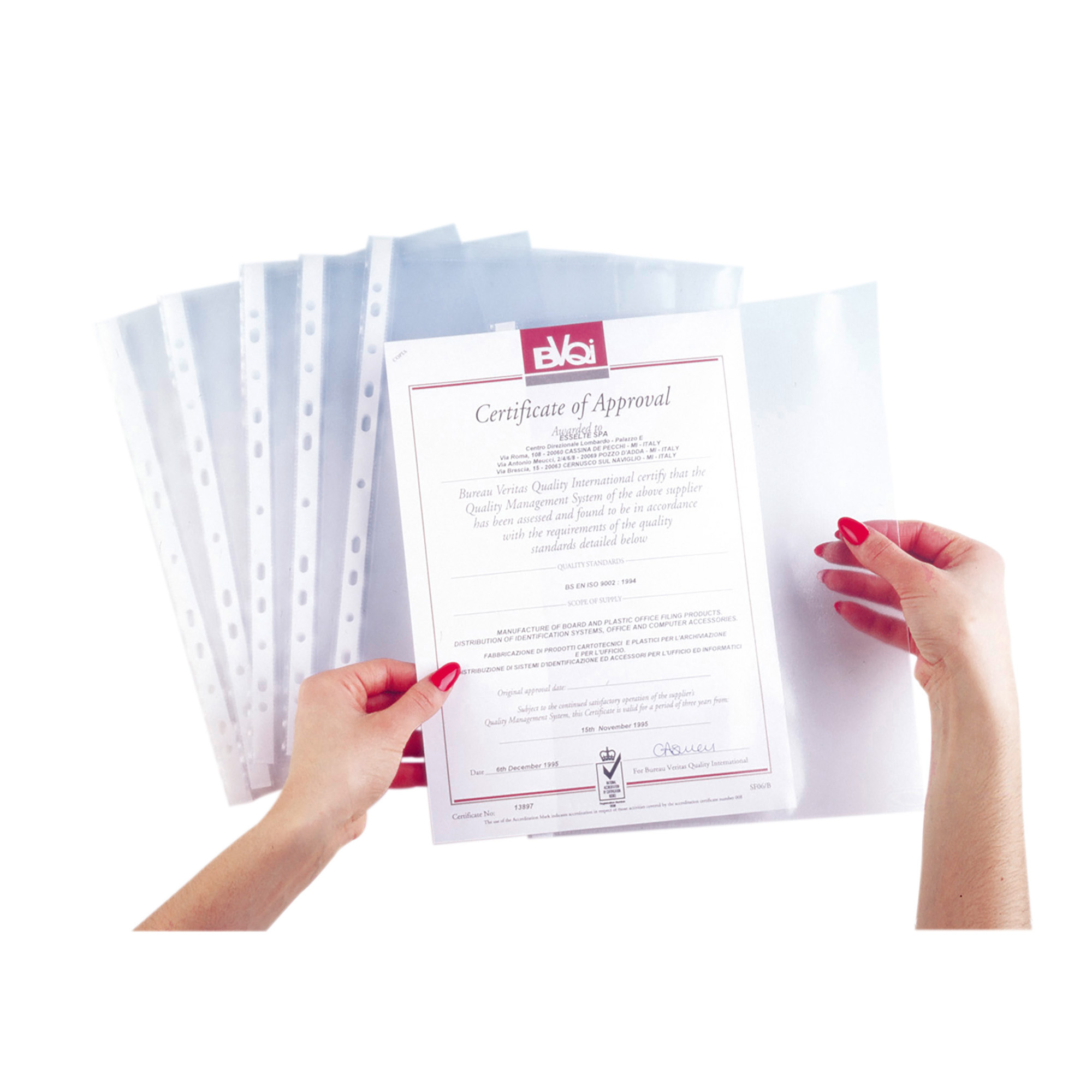 Buste con banda laterale a perforazione universale realizzate in polipropilene antiriflesso.