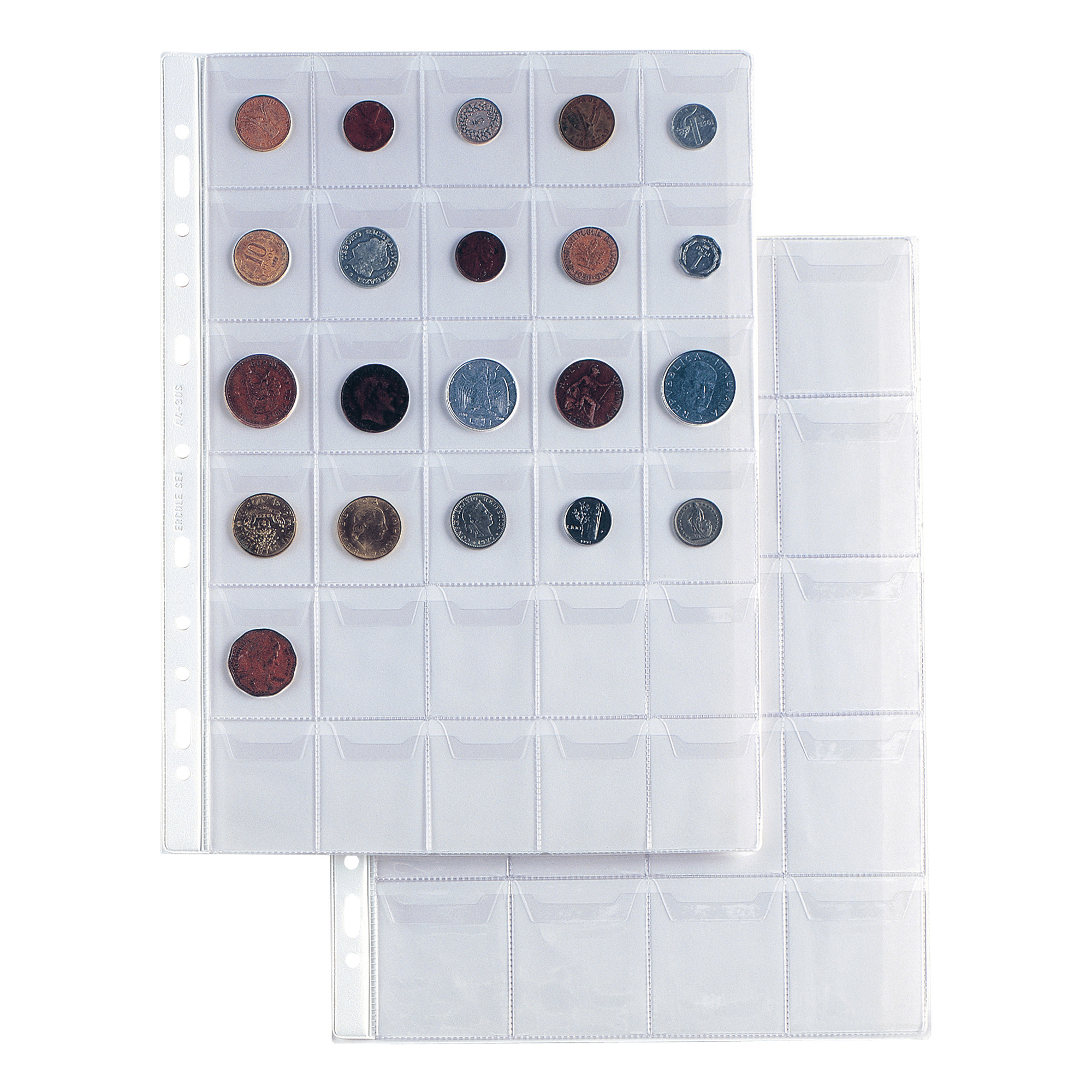 Buste con foratura universale rinforzata in PVC per la raccolta di monete di varie dimensioni. Dotate di chiusura particolare per evitare l'uscita accidentale. Dotata di 30 tasche da 3,4x4,5cm. Formato busta 21x29.7cm. Confezione da 10 buste.