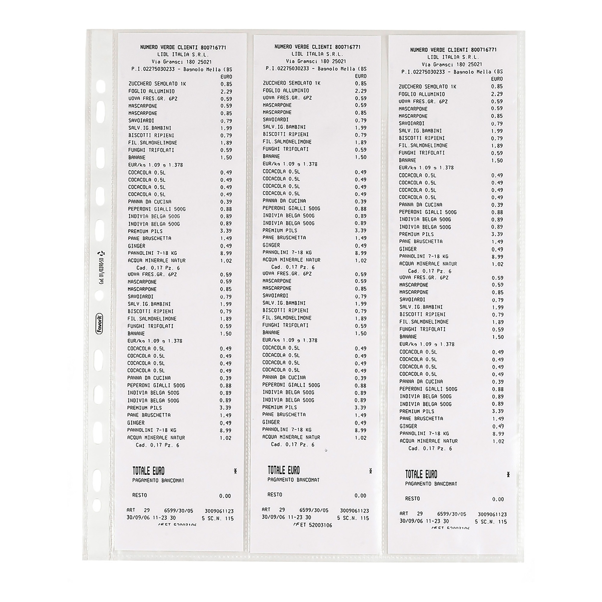 Confezione da 10 buste porta scontrini fiscali Favorit in Naturene (polipropilene) a 3 strati, con foratura universale e banda di rinforzo.
