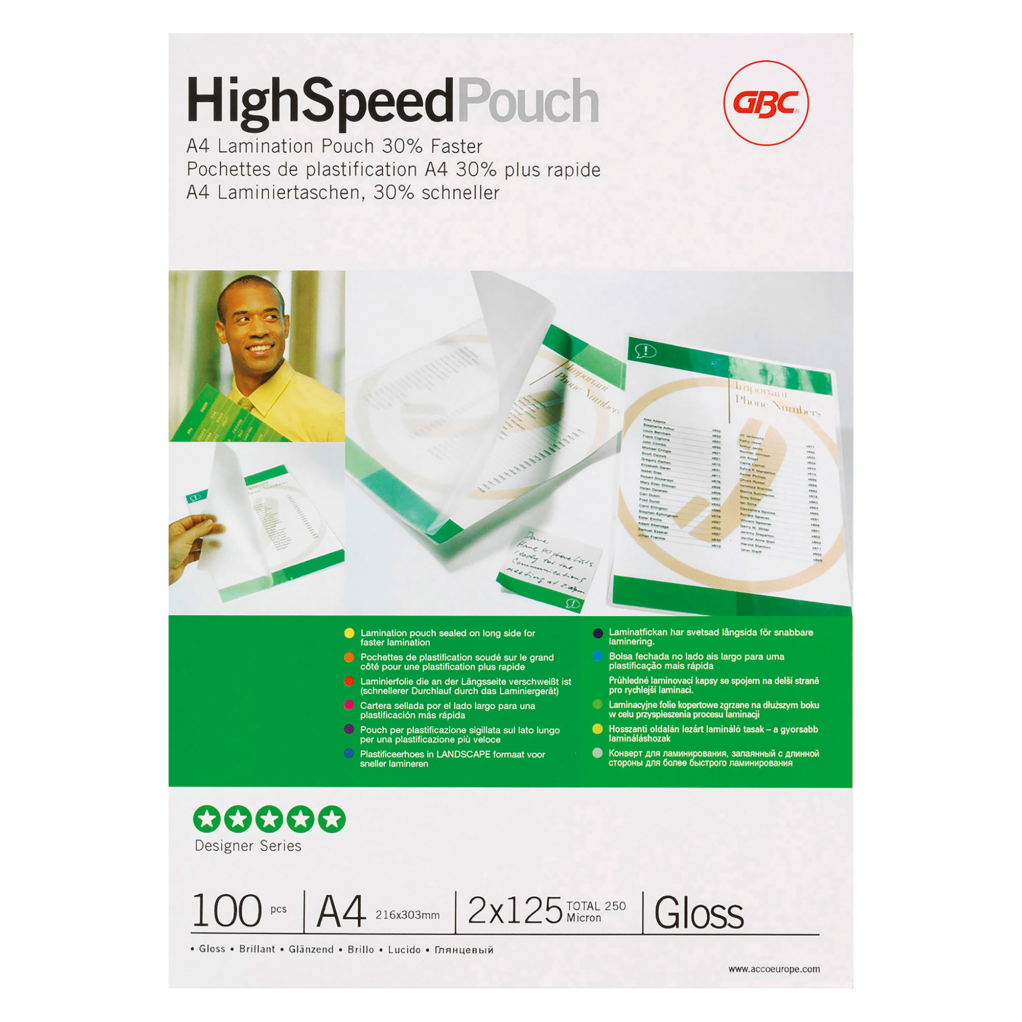 Una gamma di accessori progettata per perfezionare e personalizzare i tuoi documenti plastificati. GBC Pouch HighSpeed A4 - 2x125 micron.