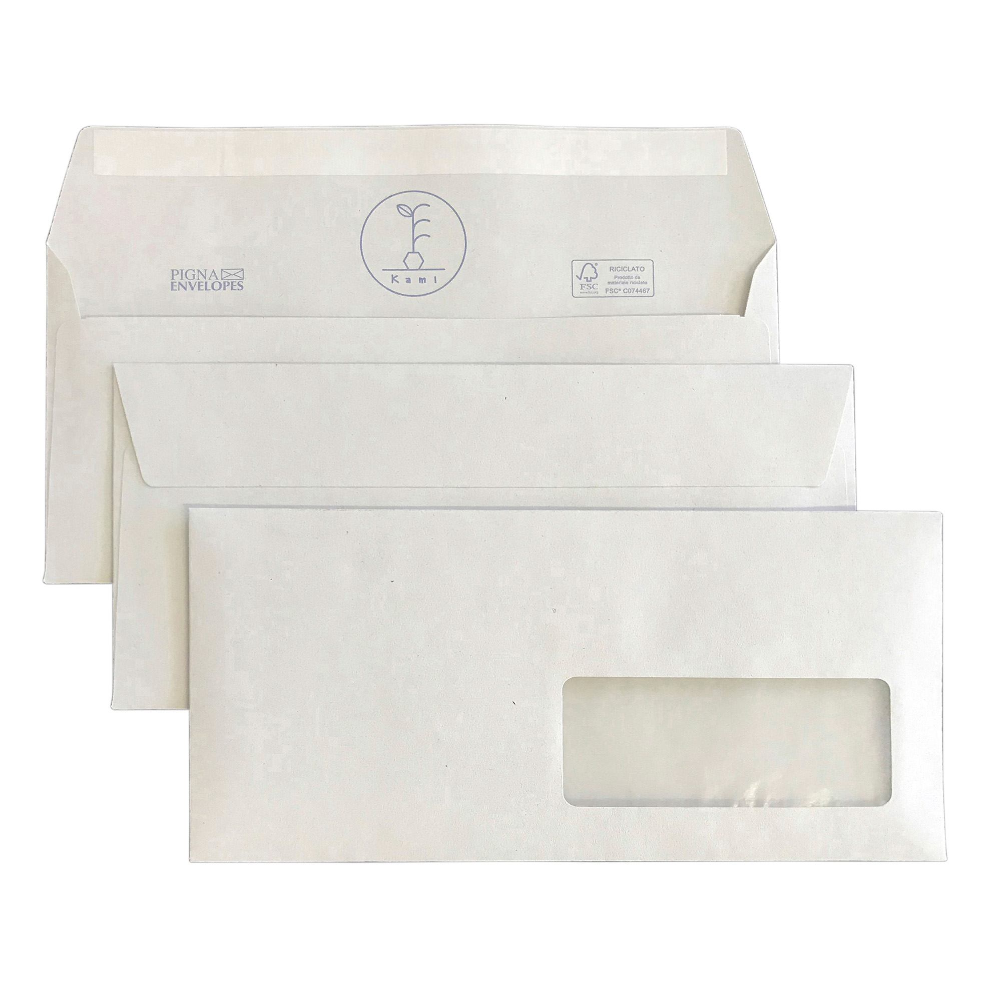 Buste a sacco carta riciclata strip 110x230 mm con finestra 100 gr Kami Pigna.