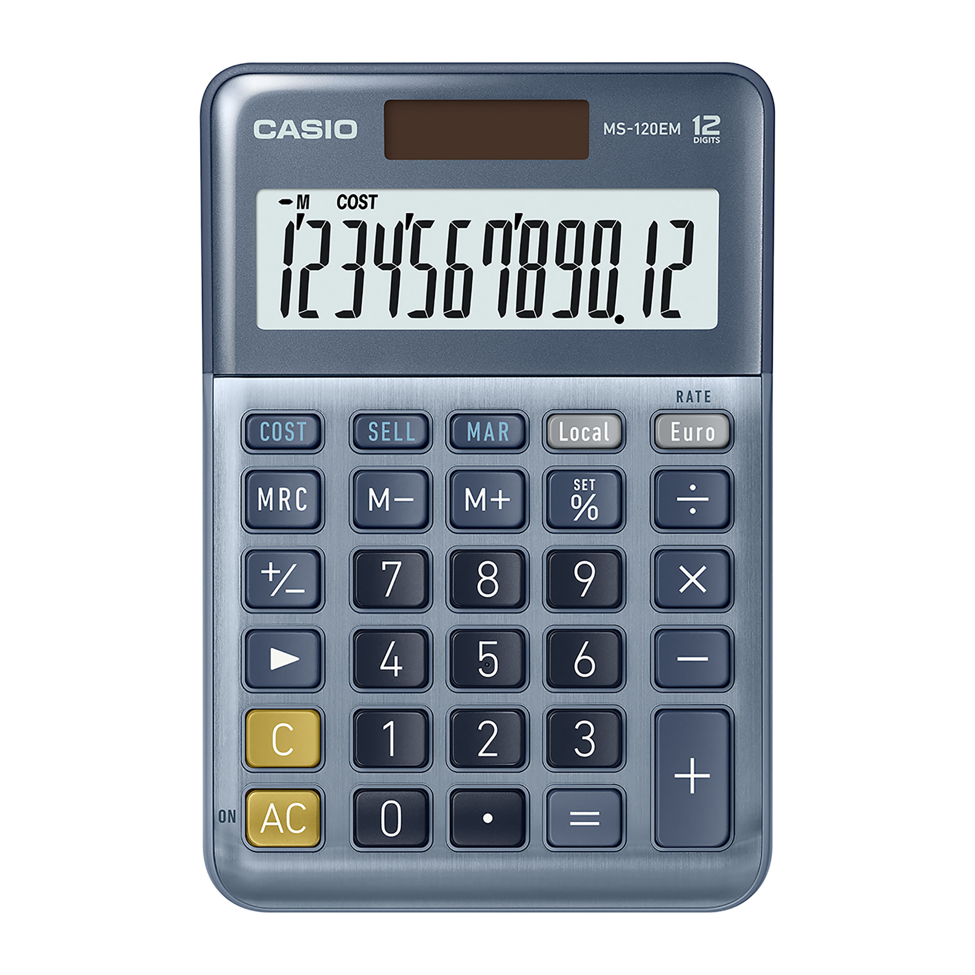 Calcolatrice da tavolo ad ampia visualizzazione con calcolo della percentuale, IVA e profitto con display LC BIG a 12 cifre. Funzioni: conversione di valuta, la percentuale professionale, il costo/sell/margin e offre funzioni come Mark Up con tasto percentuale, pulsante di correzione rapida, cambio segno e buffer di input.