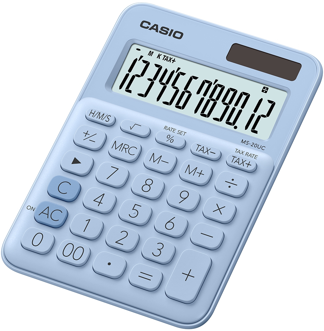 "Calcolatrice da tavolo con display a 12 cifre e con possibilità di effettuare diversi calcoli come: calcolo IVA, calcolo del tempo e calcolo della percentuale ed è dotata di radice quadrata, 3 tasti memoria, tasto cambio segno (+/-), tasto cancella ultima cifra.