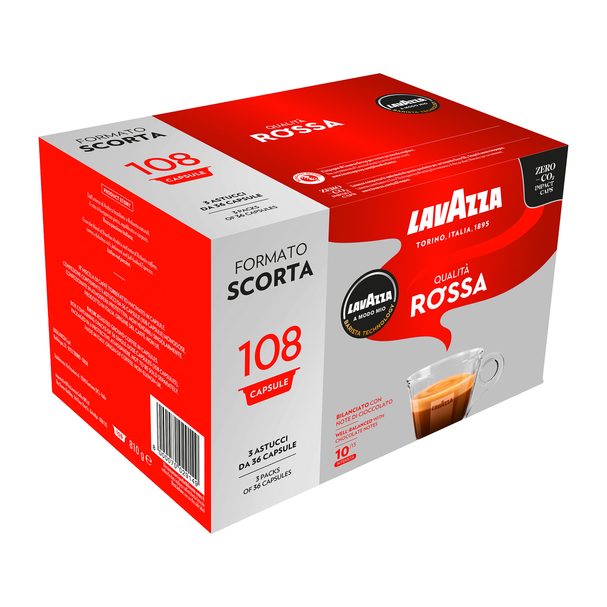 Descrizione dettagliataDall'unione di Arabica brasiliane e Robusta naturali il mito si fa espresso pieno, equilibrato e corposo. Rossa passione italiana.Profilo e tostaturaVista: Crema dorata, colore caldoOlfatto: Cioccolato, frutta seccaGusto: Pieno e sostenutoNote aromatiche: Cioccolato, frutta seccaTostatura: MediaMiscelaComposizione: Arabica e RobustaOrigine: Sud America, Africa