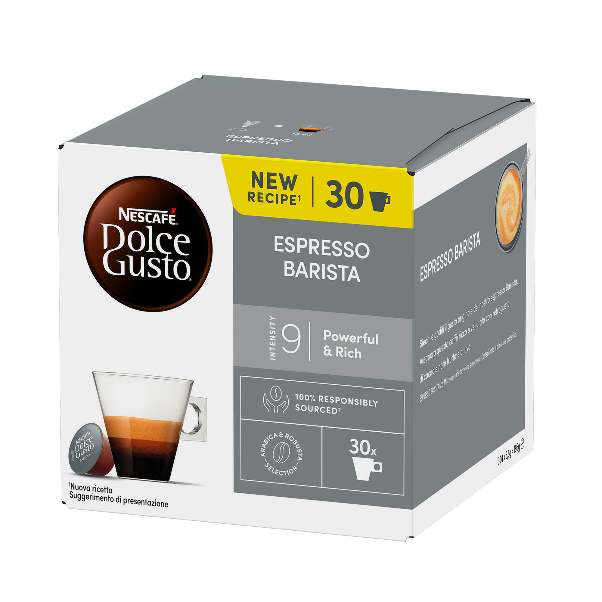 Descrizione dettagliataCaffè Nestlè Dolce Gusto Barista Caffè Selezione Arabica e RobustaPowerful & RichIntensità 9