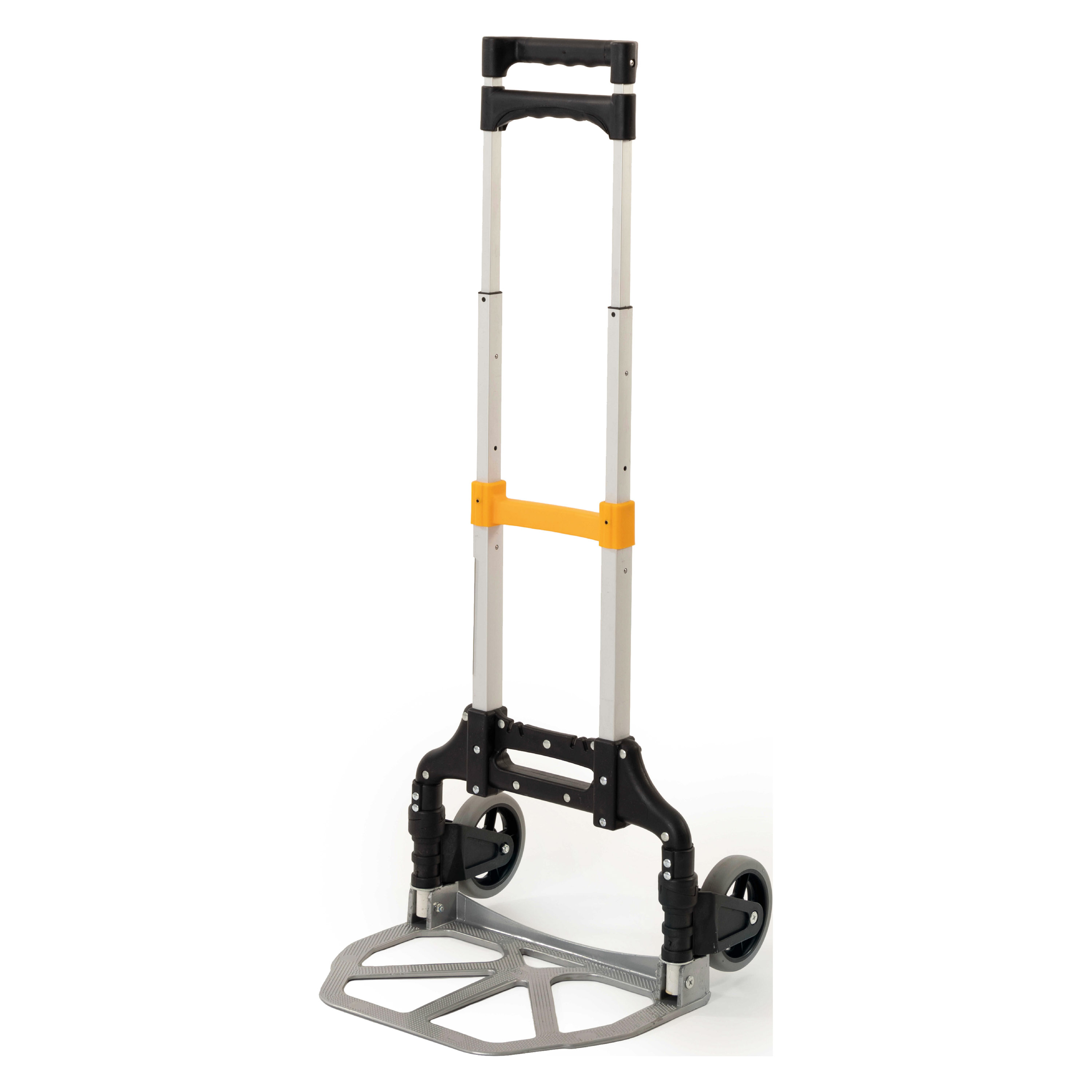 Carrello pieghevole in alluminio in sacco termoretraibile, le solide ruote in gomma termoplastica funzionano in modo silenzioso e sicuro. Modello certificato TUV-GS La robusta piastra di carico è realizzata in alluminio per mantenere basso il peso.