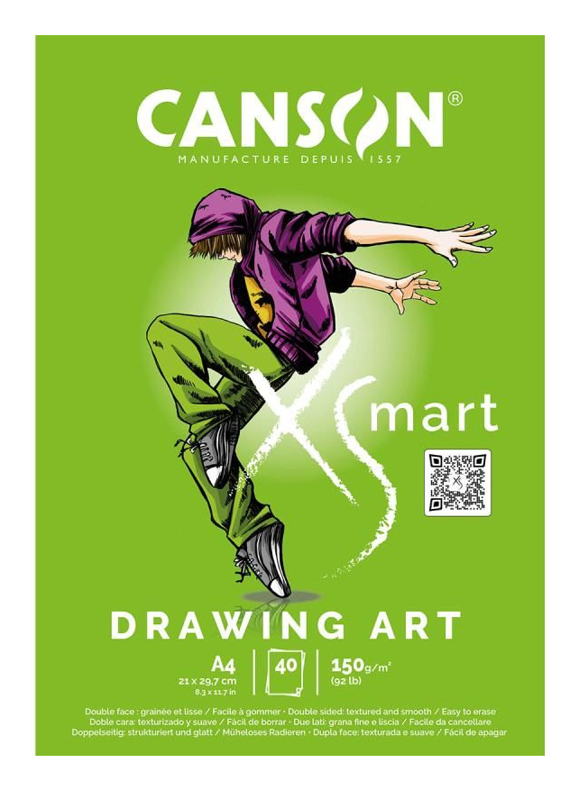 Canson C32250P002. Tipo: Blocco di carta da disegno, Quantità di fogli: 40 fogli, Peso medio: 150 g/m². Larghezza del foglio: 21 cm, Lunghezza del foglio: 29,7 cm. Certificati di sostenibilità: Forest Stewardship Council (FSC). Paese di origine: Francia