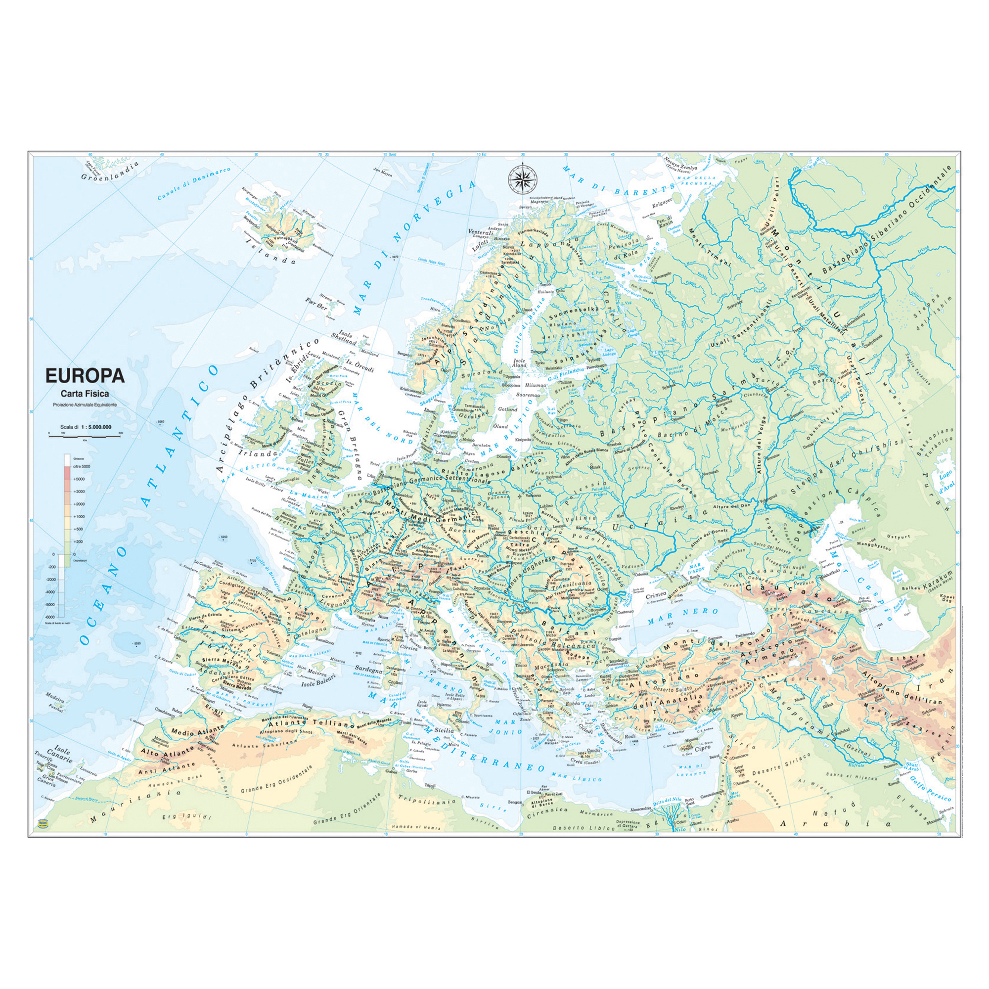 Descrizione dettagliataCartina scolastica murale fisico/politica. Plastificazione antiriflesso . Aste di supporto in plastica. Scala 1:5.000.000. f.to 132x99cm