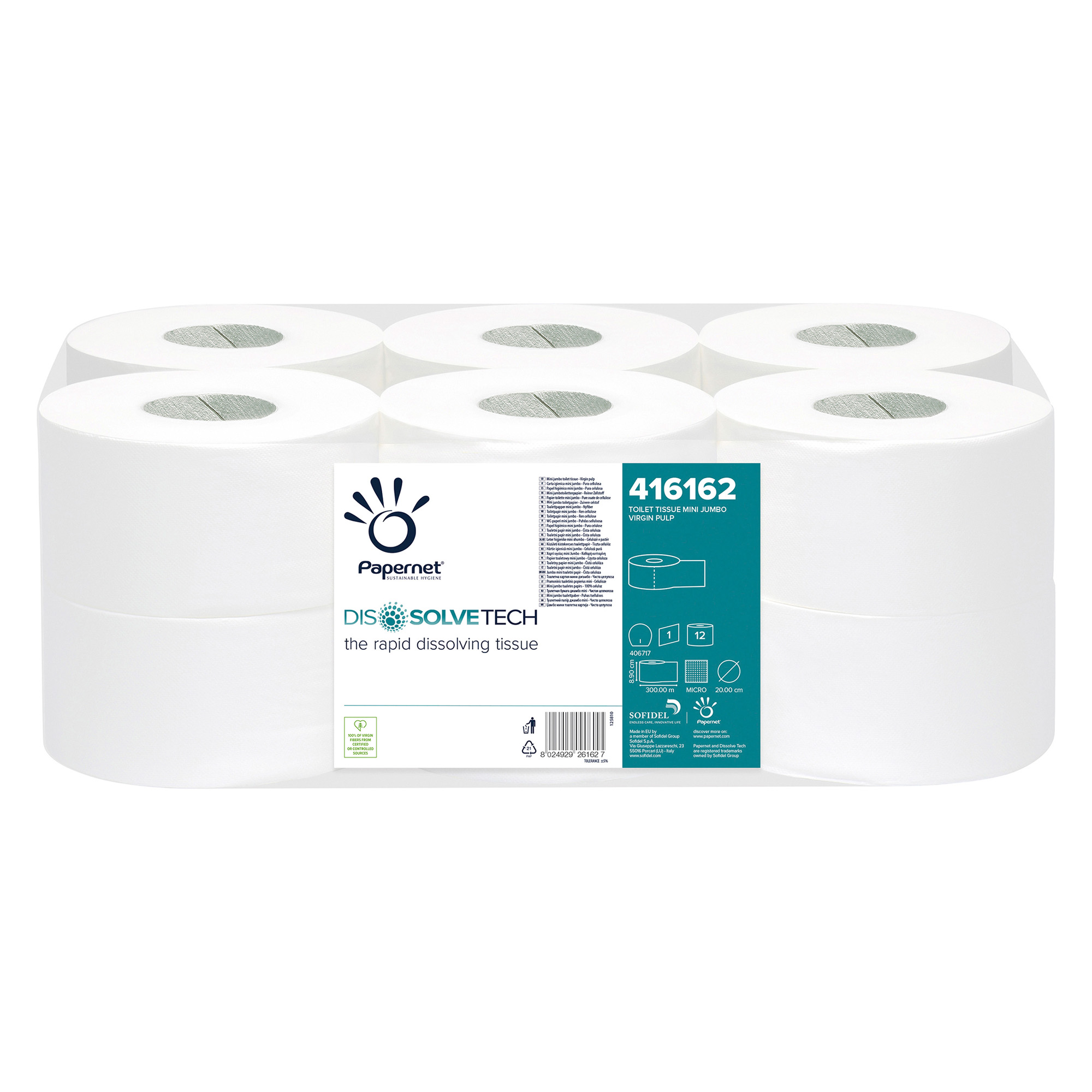 La Carta Igienica Mini Jumbo - 416162 Dissolve Tech è stata realizzata con 1 velo, con carta in pura cellulosa ed è di colore bianco.
