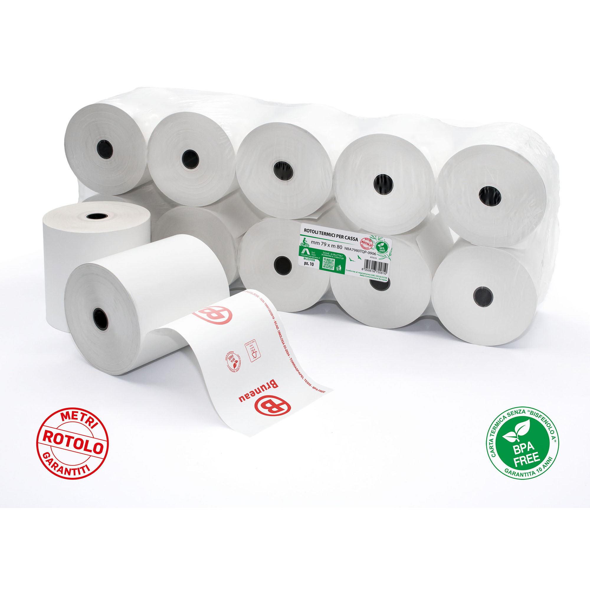 Descrizione dettagliataROTOLI IN CARTA TERMICA OMOLOGATA PER REGISTRATORI DI CASSA LUNGHEZZA 80 MM BRUNEAUCarta termica omologata in rotolo per registratori di cassa larghezza 80 mm, diametro mandrino da 12 mmLunghezza: 80 m In regola con quanto disposto dalla commissione europea in data 12 Dicembre 2016 (regolamento UE 2016/2235)Ha una durata certificata di 10 anni* (va conservata in ambienti con umidità controllata a temperatura tra i 12 e i 28 gradi)BPA FreeBlister da 10 rotoli