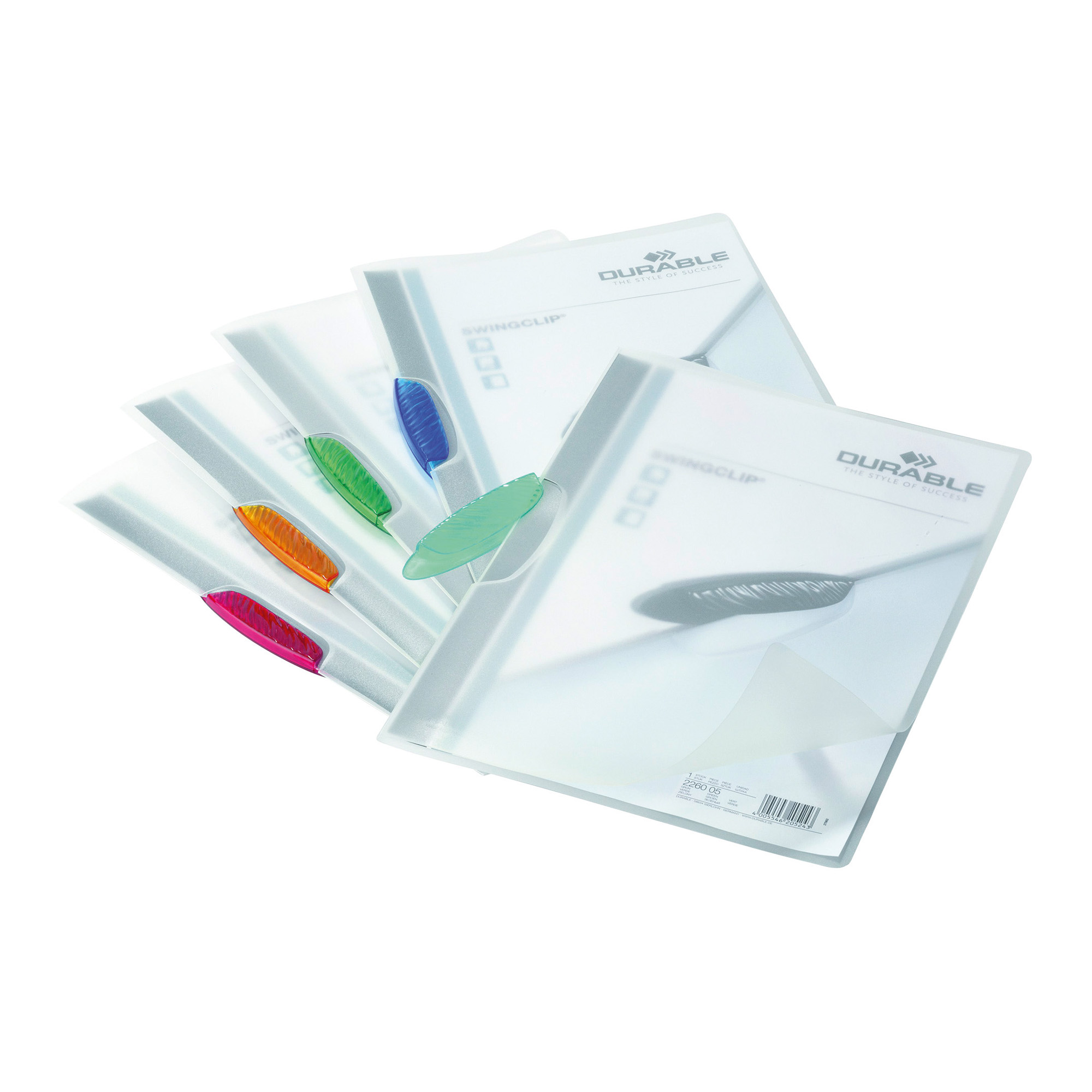 Realizzata in polipropilene, Swingclip è un raccoglitore trasparente con una clip a perno colorata.