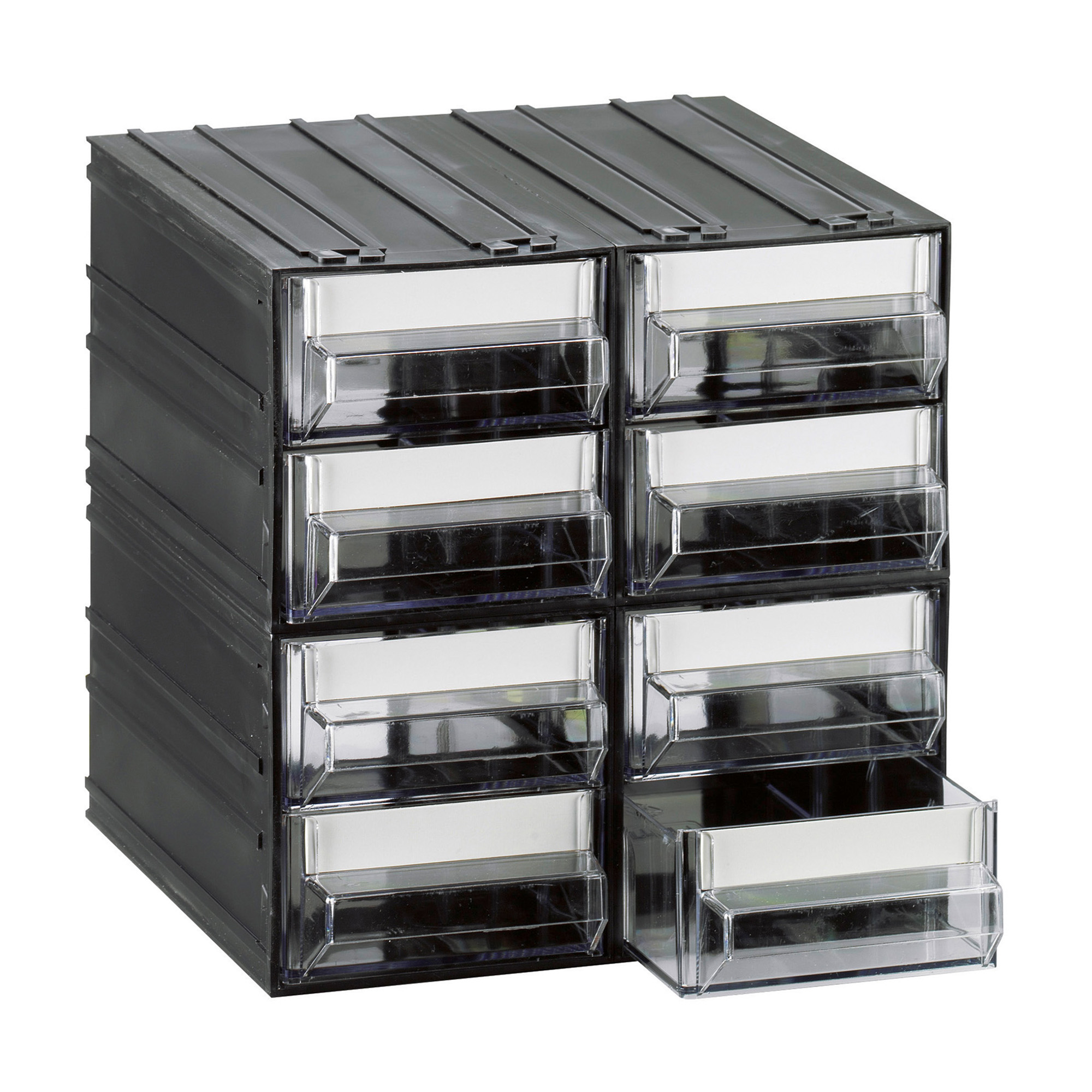 Cassettiera modulare porta-minuteria realizzata in PST (Polistirene) con corpo esterno nero e 8 cassetti trasparenti.