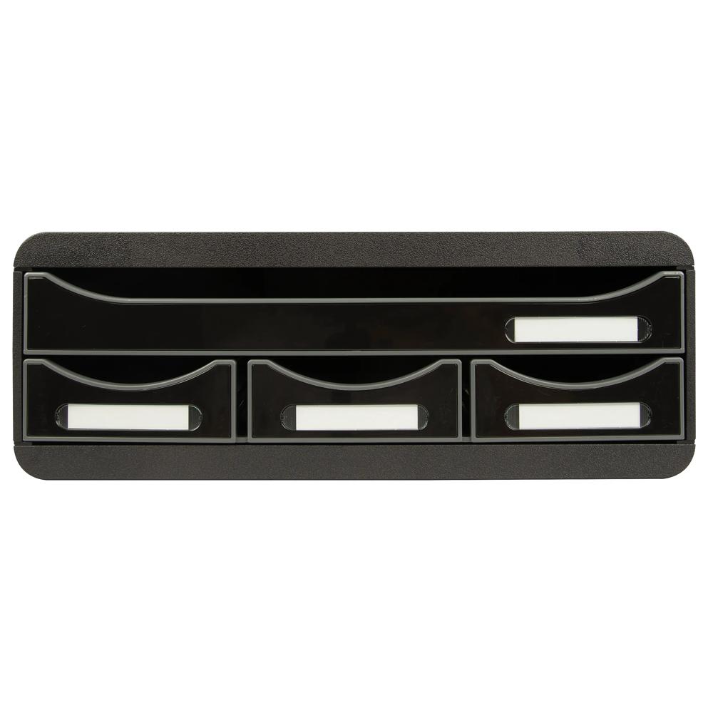 Cassettiera composta da 4 cassetti tra 1 grande che consente l'inserimento diretto dei documenti (A4, A4+ o 24x32 cm) nel cassetto s enza doverlo aprire e 3 cassetti piccoli per riporre oggestica.
