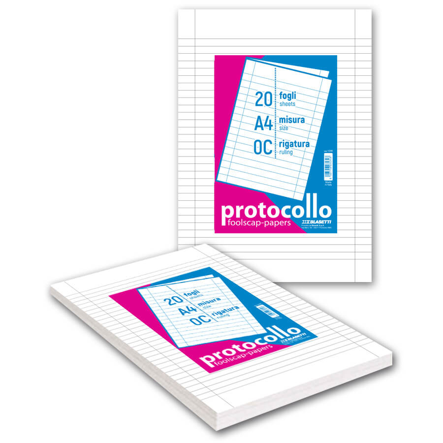 Blasetti Fogli protocollo in pacchetti. Colorazione: Monocromatico, Colore del prodotto: Bianco, Formato: A4, Quantità di fogli: 20 fogli, Peso medio: 60 g/m², Tipo di carta prevalente: Carta rigata, Tipo di copertina per libro: Libro in brossura
