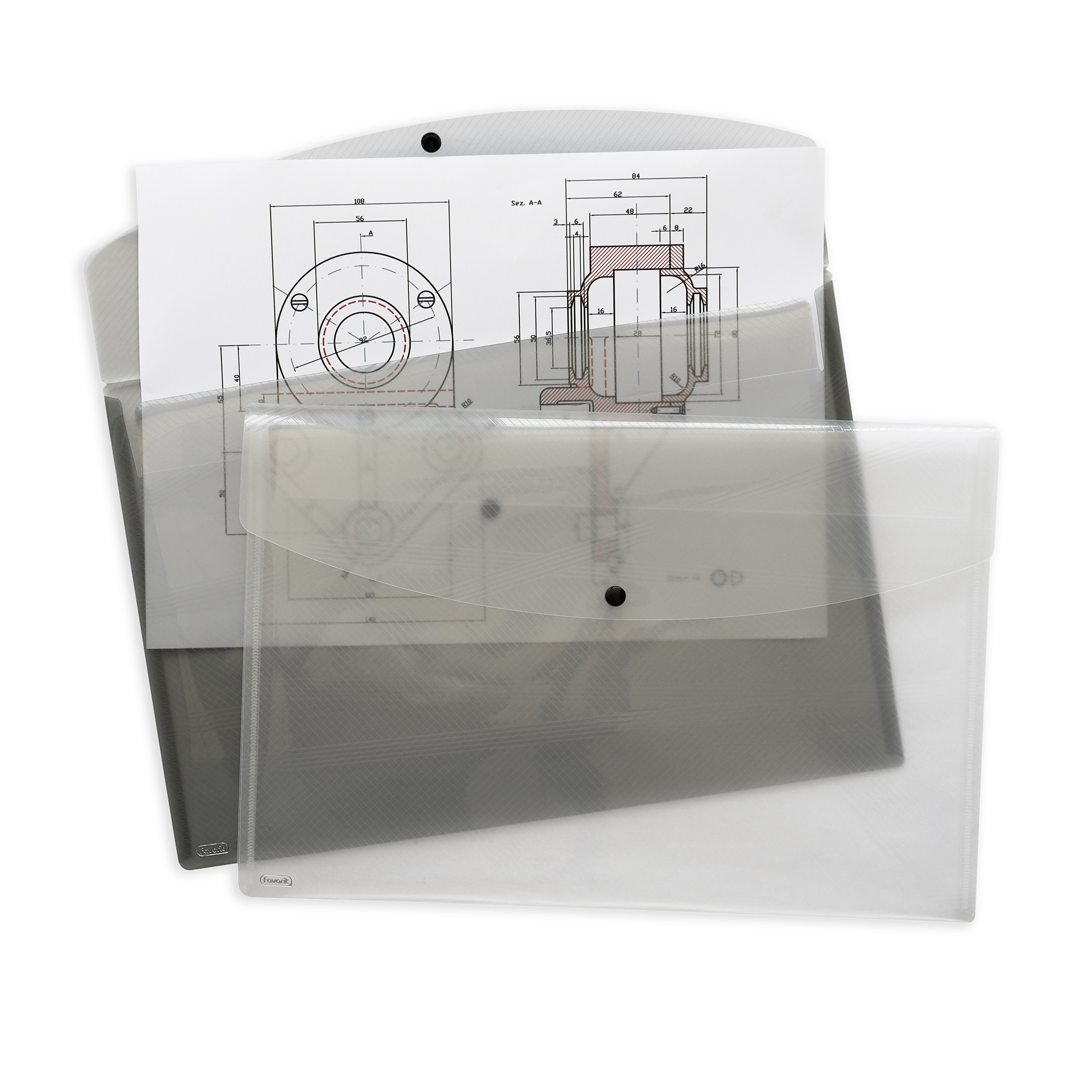 Realizzate in polipropilene traslucido con texture grafica che combina un gioco di intersezioni tra linee. Chiusura con bottone a pressione di colore nero. Sono indispensabili per proteggere e trasportare documenti o oggetti vari. Disponibili in vari formati e in 6 brillanti colori: rosso, azzurro, verde chiaro, viola, grigio e trasparente.