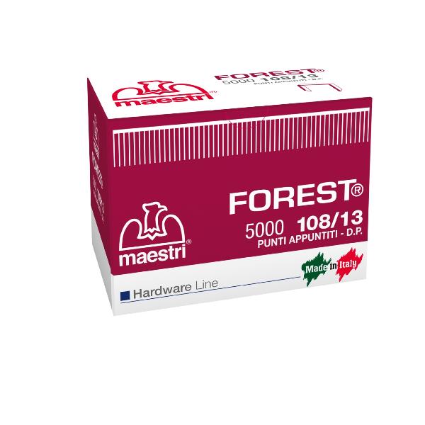 Tutti i punti metallici Maestri si distinguono per la qualità della materia prima e per l’eccellenza di fabbricazione con particolare accuratezza all’angolo di piega ed alla simmetria del punto, unite al taglio delle punte per consentire una corretta penetrazione, costituiscono la garanzia qualitativa necessaria al buon funzionamento delle fissatrici. L’uso del punto originale ro-ma Maestri è sempre da preferirsi. La punta “FOREST” garantisce una ottima penetrazione ed un eccellente tenuta del punto nel legno.