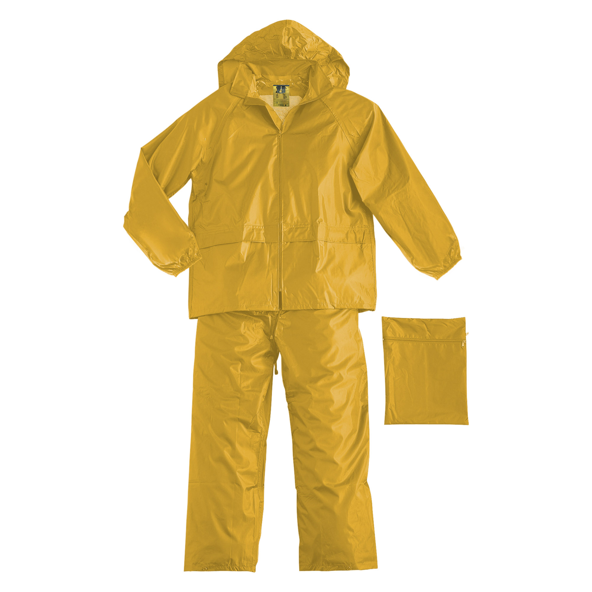 Completo giacca e pantalone con chiusura centrale con cerniera, cappuccio inserito nel collo, fori di aerazione sotto le ascelle, cordino stringivita ed elastico ai polsi, maniche raglan.