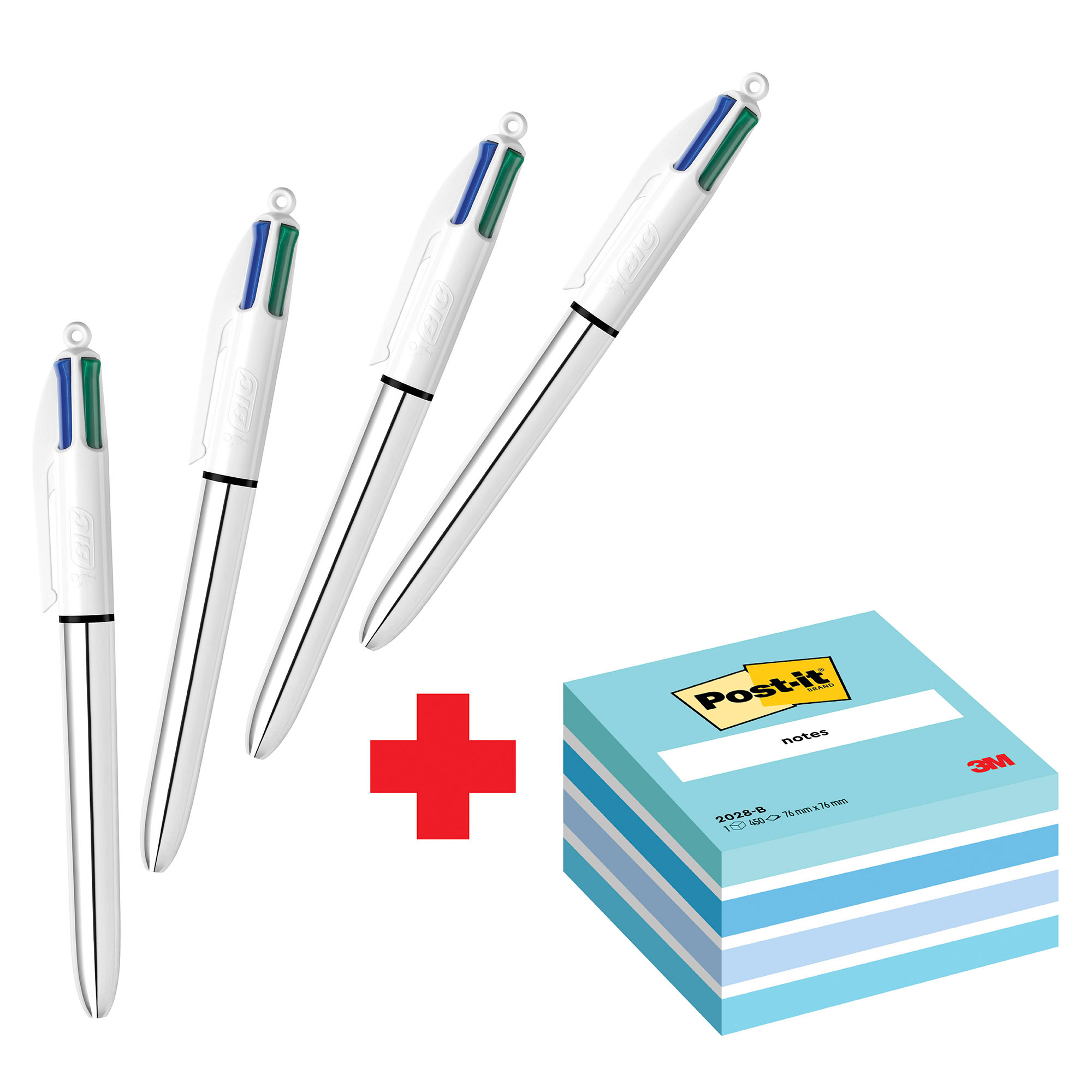 Confezione speciale 4 Penne 4 colori Shine Silver Bic e 1 cubo 76x76 mm Blu Pastel Post it