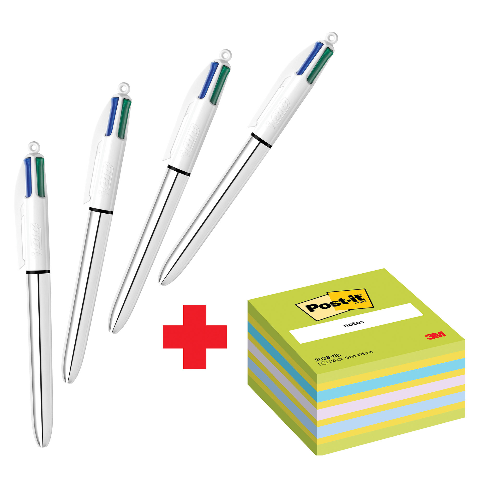 Confezione speciale 4 Penne 4 colori Shine Silver Bic e 1 cubo 76x76 mm Blu Verde Neon Post it