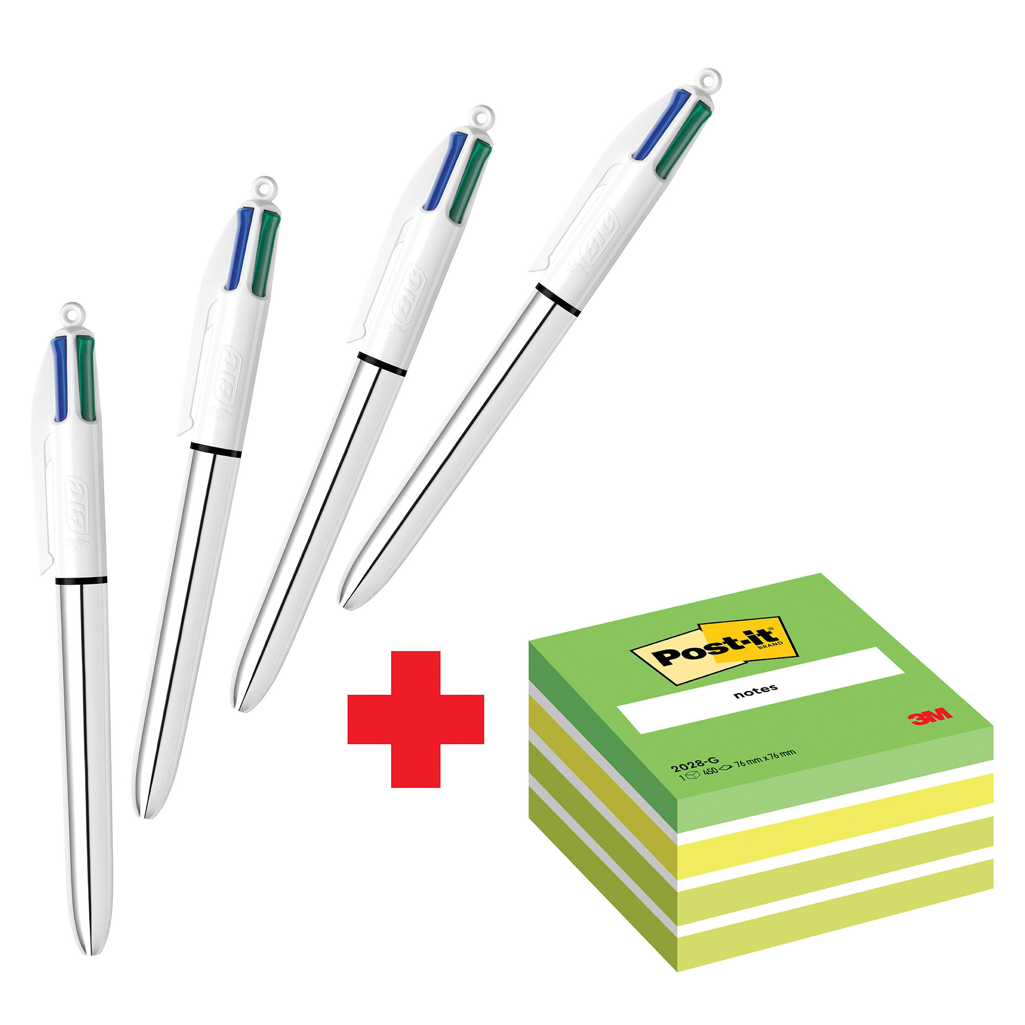 Confezione speciale 4 Penne 4 colori Shine Silver Bic e 1 cubo 76x76 mm Verde Pastel Post it