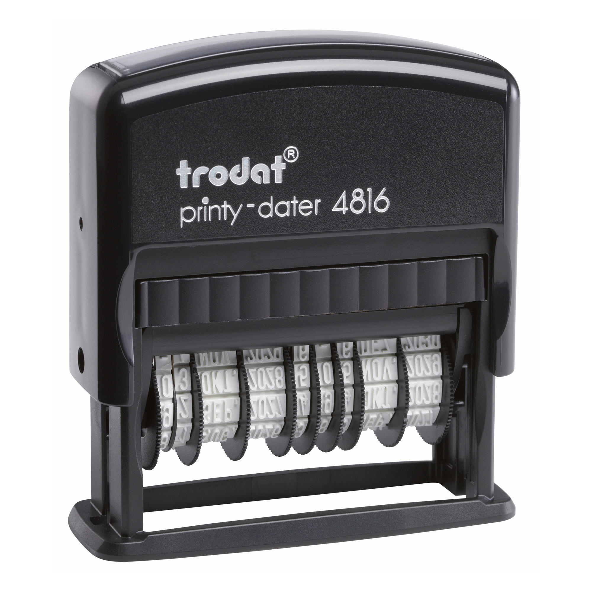 Il nuovo timbro Trodat printy 4816/PL presenta il classico stile originale Printy ma vanta alcune caratteristiche aggiuntive, come la base monoblocco, che rende il timbro piu` stabile, le rotelle piu` morbide e leggermente piu` grandi, che consentono di mantenere le dita pulite quando si imposta la data, e una base nera, che aggiunge un tocco moderno al design originale.