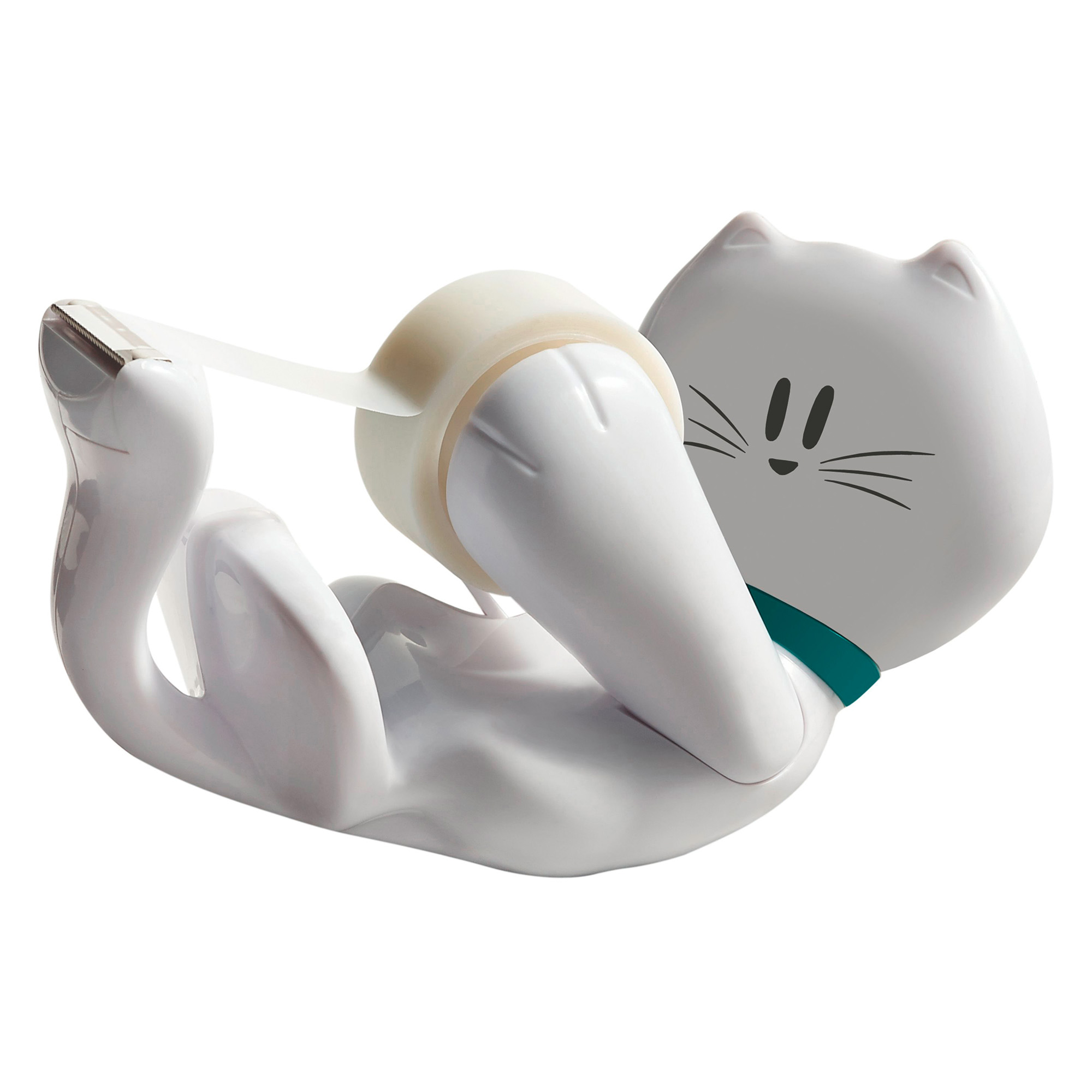 Accessorio attraente sulla tua scrivania, questo esclusivo dispenser tendinastro Scotch C39 ha la forma di un gatto sdraiato sulla schiena che eroga il nastro dalla coda.