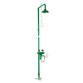 Doccia combinata con lavaocchi, soffione in polipropilene completo di valvola a chiusura manuale, azionamento a mezzo di tirante rigido con impugnatura a triangolo. lavaocchi a flusso aerato completo di valvola a chiusura manuale con apertura a mezzo di push laterale, vaschetta in polipropilene.