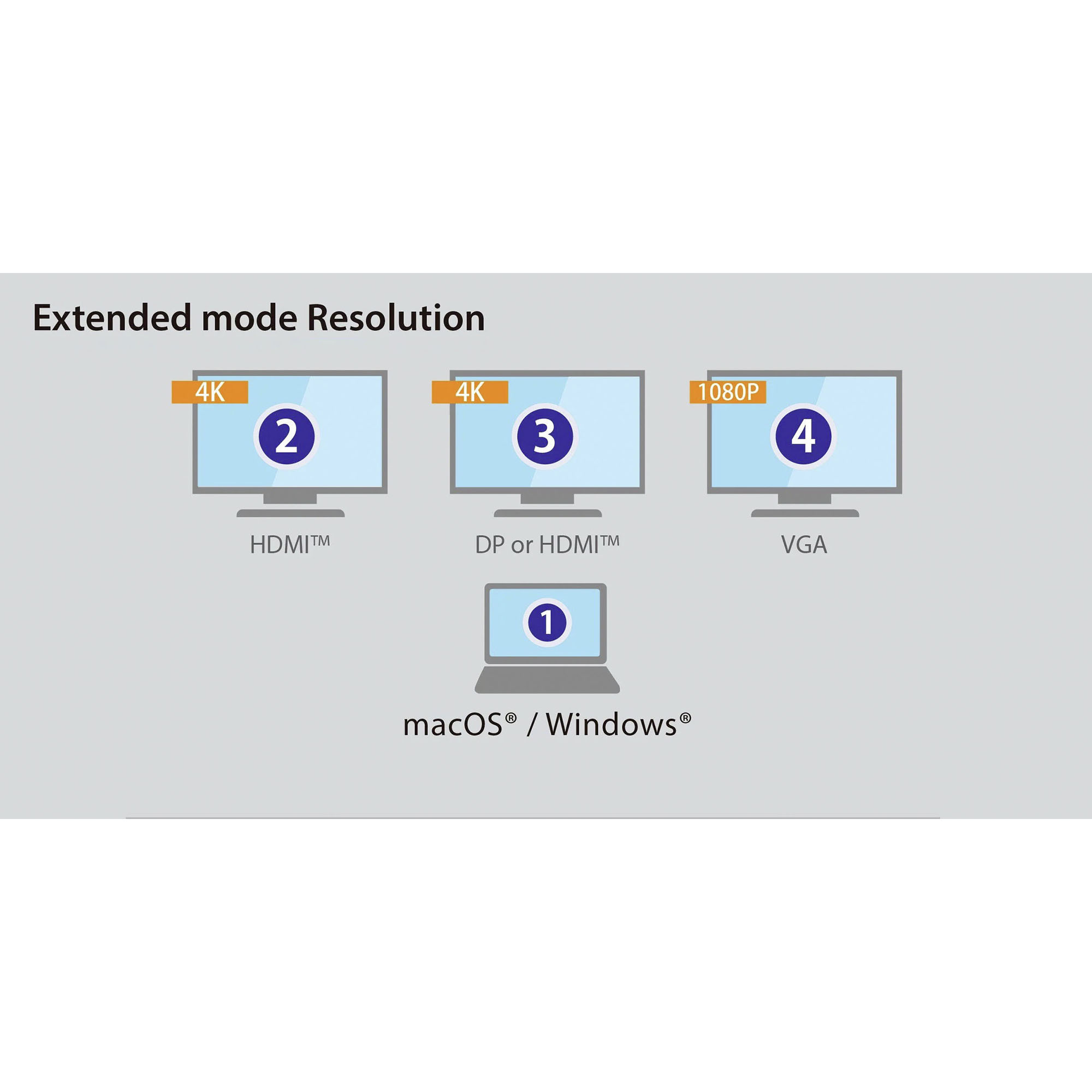 Creare una configurazione a tre monitor con uscite 4K HDMI™, VGA 1080p e 4K DisplayPort™ e, insieme al display del laptop, è possibile avere un massimo di 4 display. Combinazioni di display disponibili: