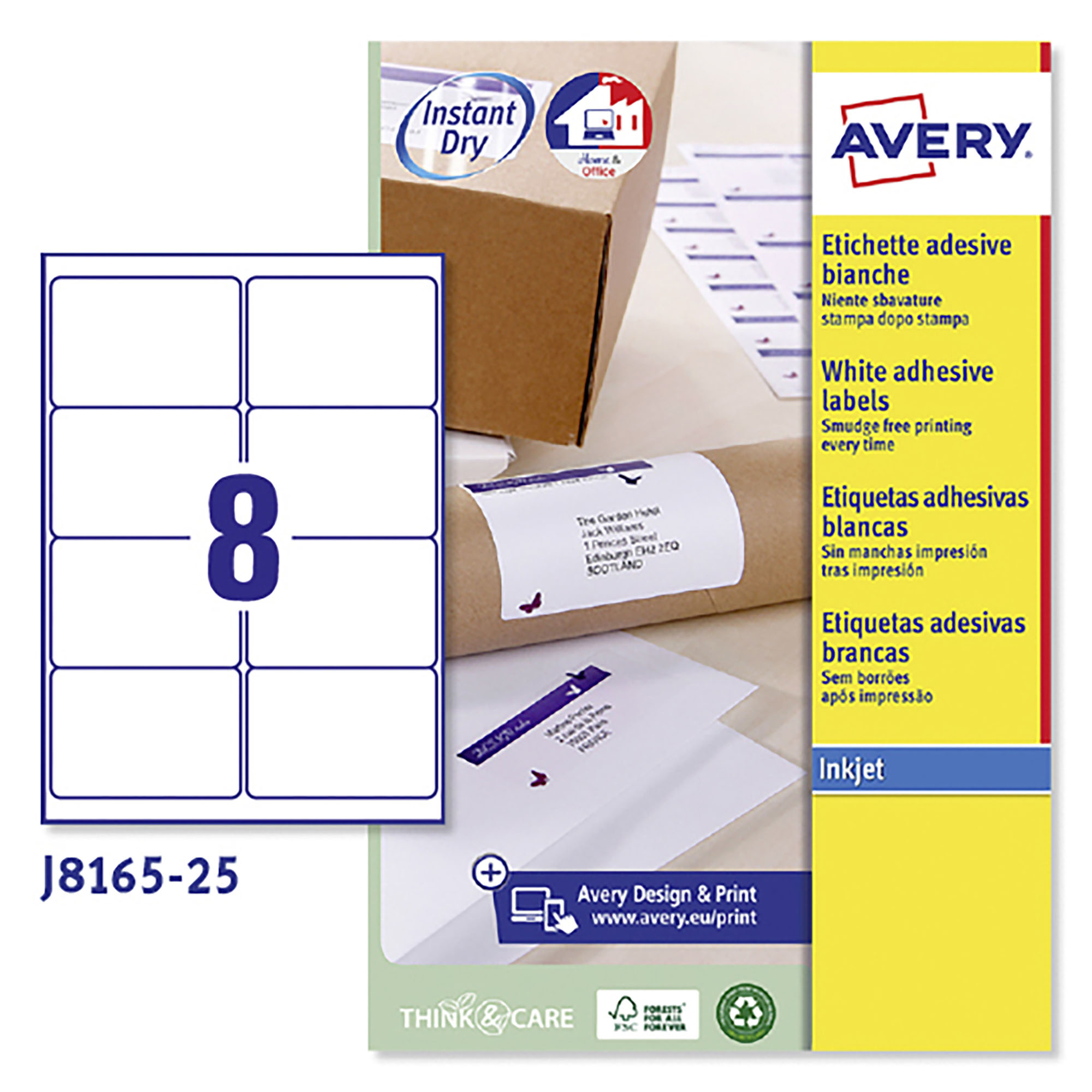 Etichette adesive Avery in carta bianca 99,1x67,7mm, 8 etichette per foglio, adesivo permanente, inkjet, 25 fogli