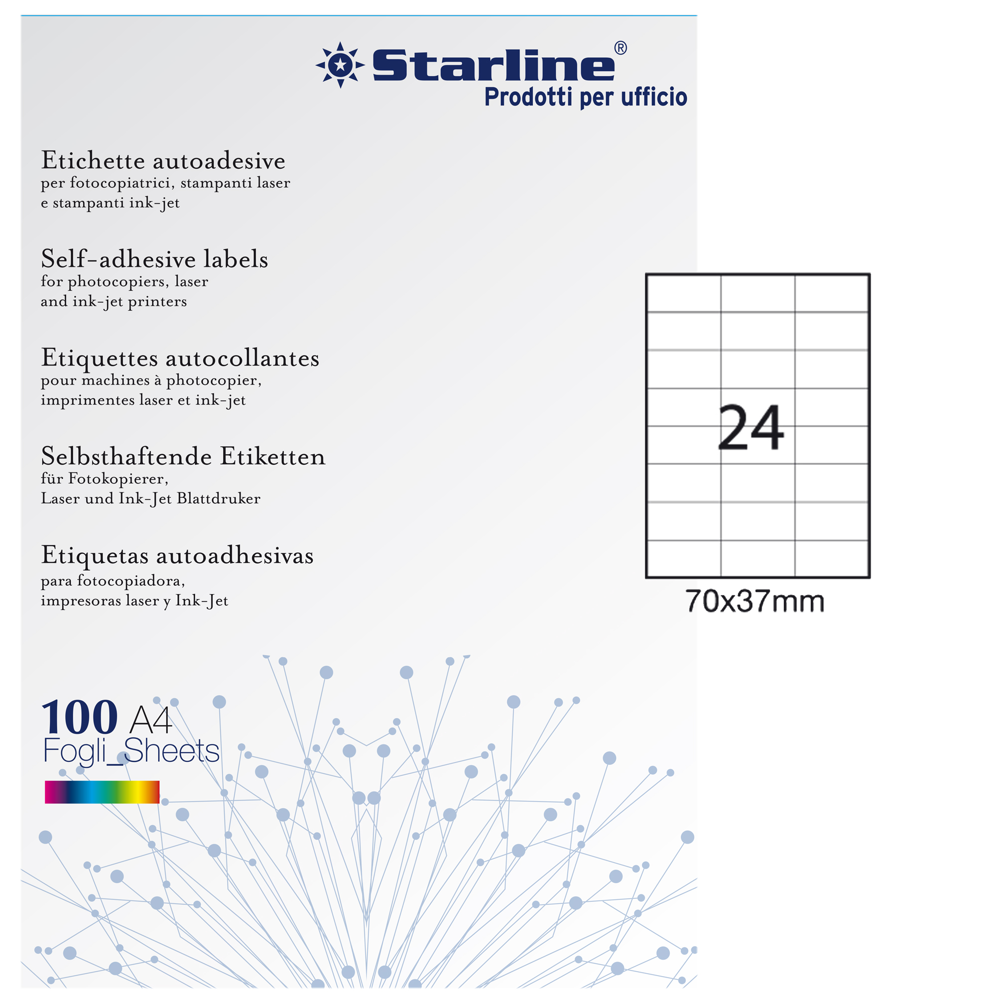 Etichette adesive bianche STARLINE utilizzabili con stampanti laser, inkjet o fotocopiatori. Adesivo permanente. Prive di margne di sicurezza lungo il perimetro. In scatola da 100 fogli formato A4.