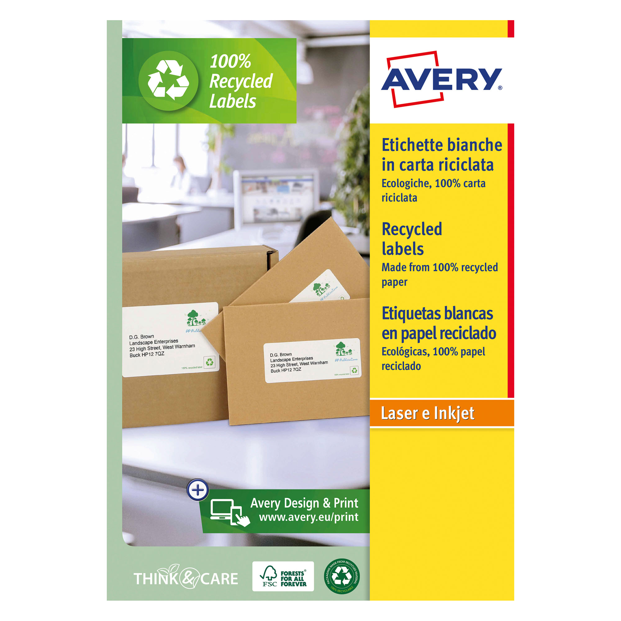 Etichette ecologiche realizzate con carta riciclata al 100%. Adesivo ecologico a base d'acqua. Sono compatibili con tutti i marchi di stampanti laser e a getto d'inchiostro. Imballaggio in cartone riciclato. Facile da staccare e veloce da applicare grazie all'esclusiva striscia peel-off di Avery.