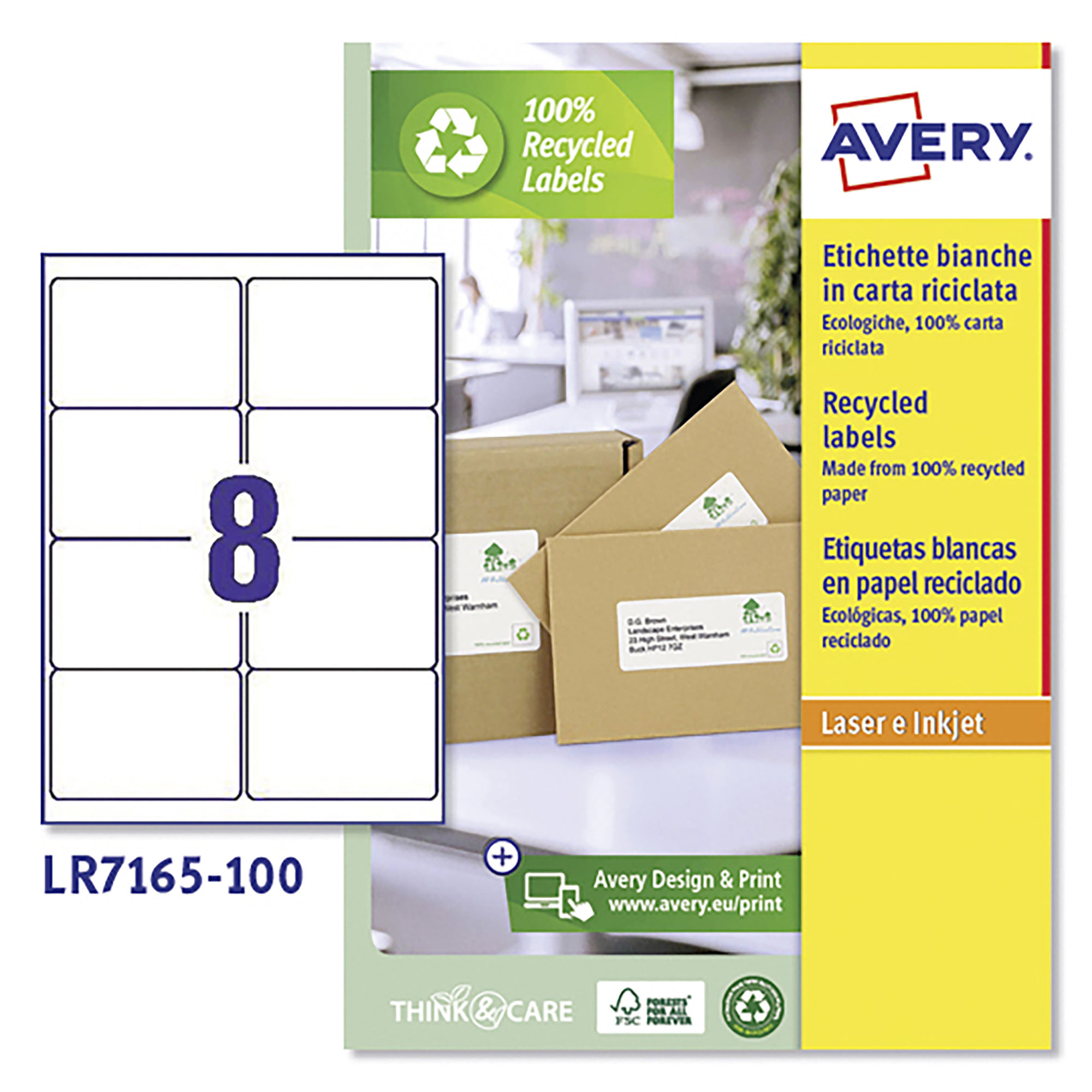 Etichette ecologiche realizzate con carta riciclata al 100%. Adesivo ecologico a base d'acqua. Sono compatibili con tutti i marchi di stampanti laser e a getto d'inchiostro. Imballaggio in cartone riciclato. Facile da staccare e veloce da applicare grazie all'esclusiva striscia peel-off di Avery.