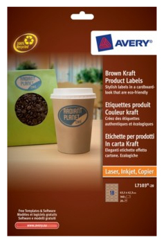 Avery Brown Kraft Product Labels. Colore del prodotto: Marrone, Materiali: Carta, Tecnologia di stampa: Ad inchiostro. Dimensione etichetta: 63,5 x 42,3. Etichette da pacchi: 360 pz, Fogli per pacco: 20 fogli. Dimensioni carta: 210 x 297 mm