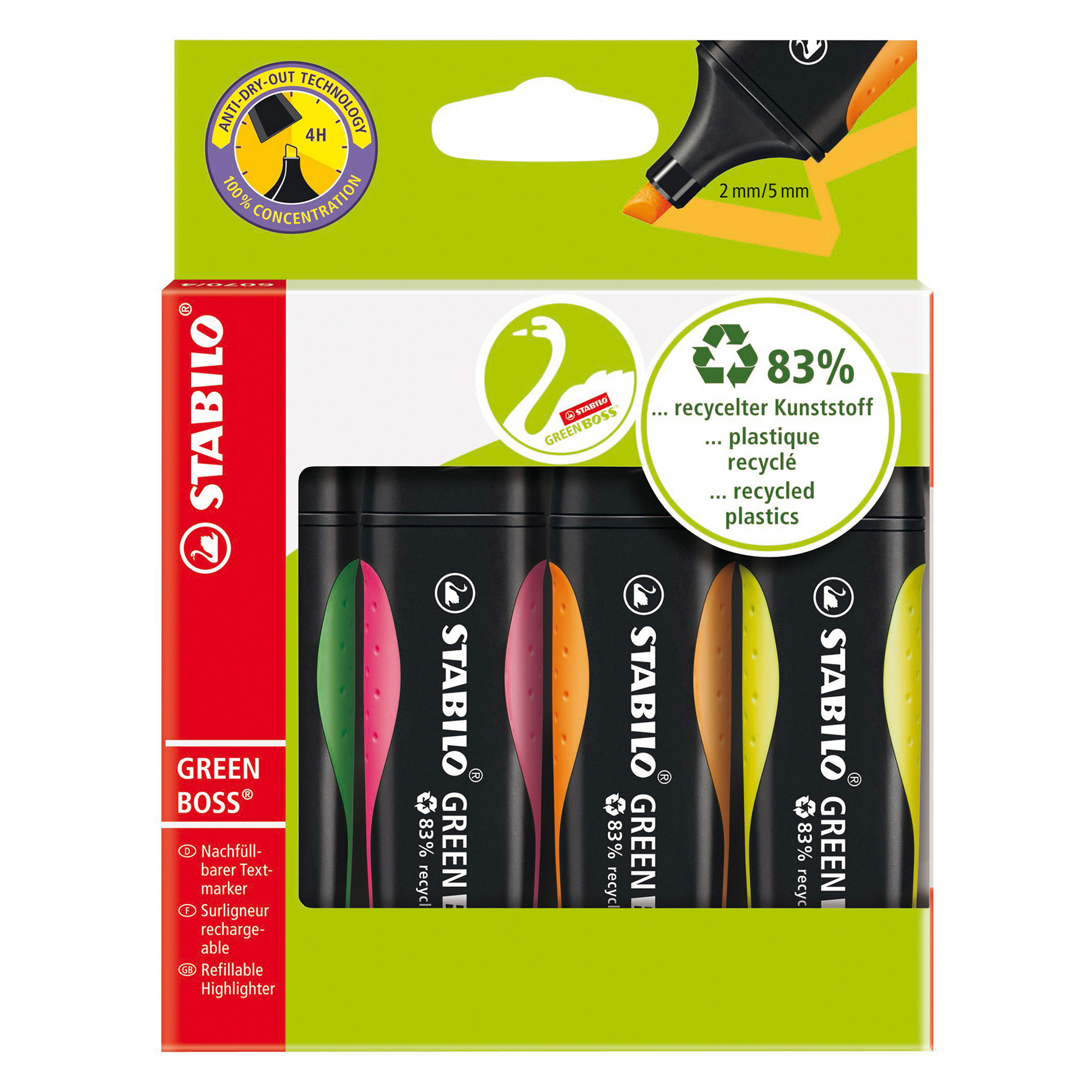L'evidenziatore STABILO GREEN BOSS, realizzato per l'83% con plastica riciclata, utilizza un affidabile inchiostro a base d'acqua con tecnologia Anti-Dry-Out che permette di non seccarsi per una durata di 4 ore senza cappuccio ed è adatto per quasi tutti i tipi di carta.