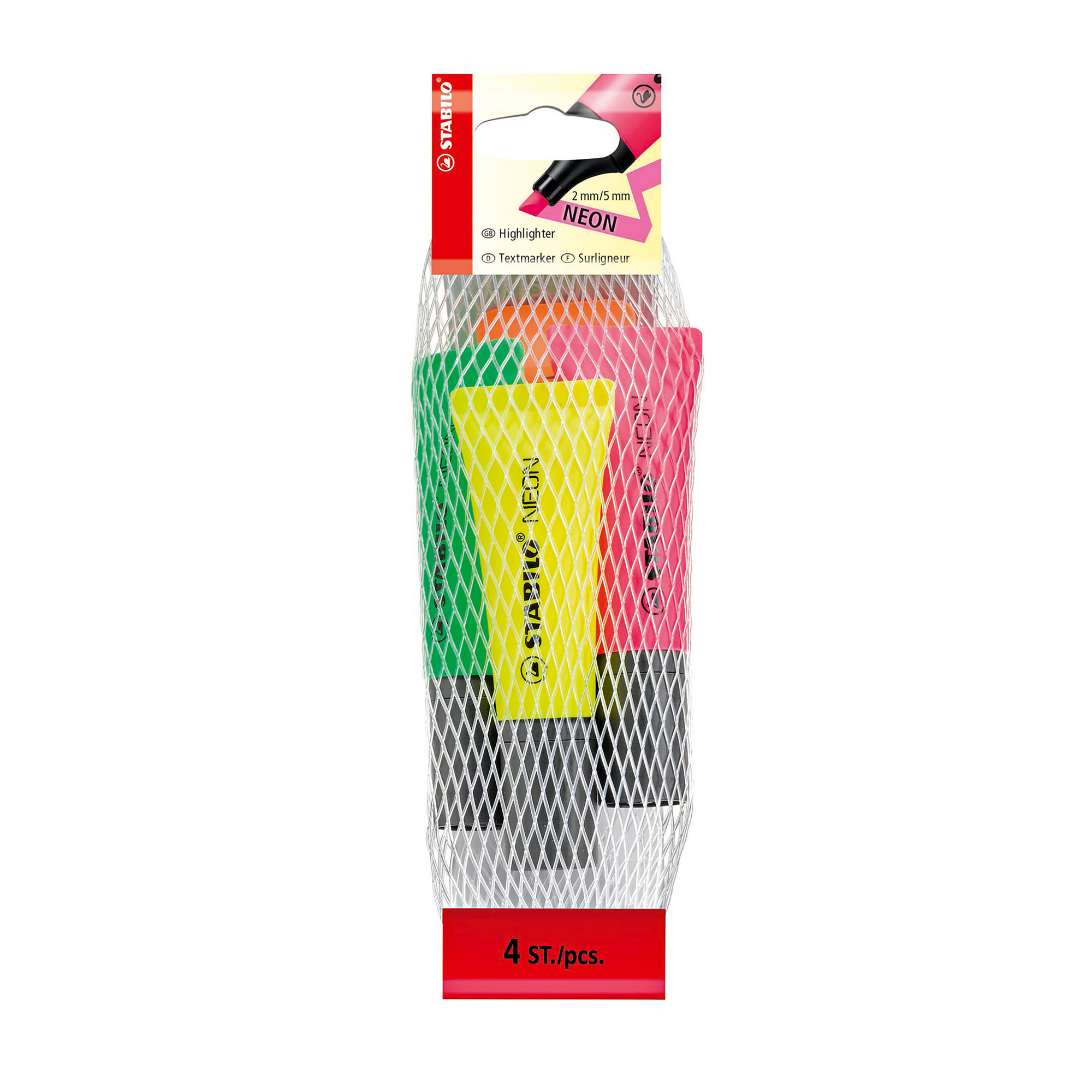Ogni confezione contiene 4 evidenziatori assortiti (giallo, arancione, verde e rosa).