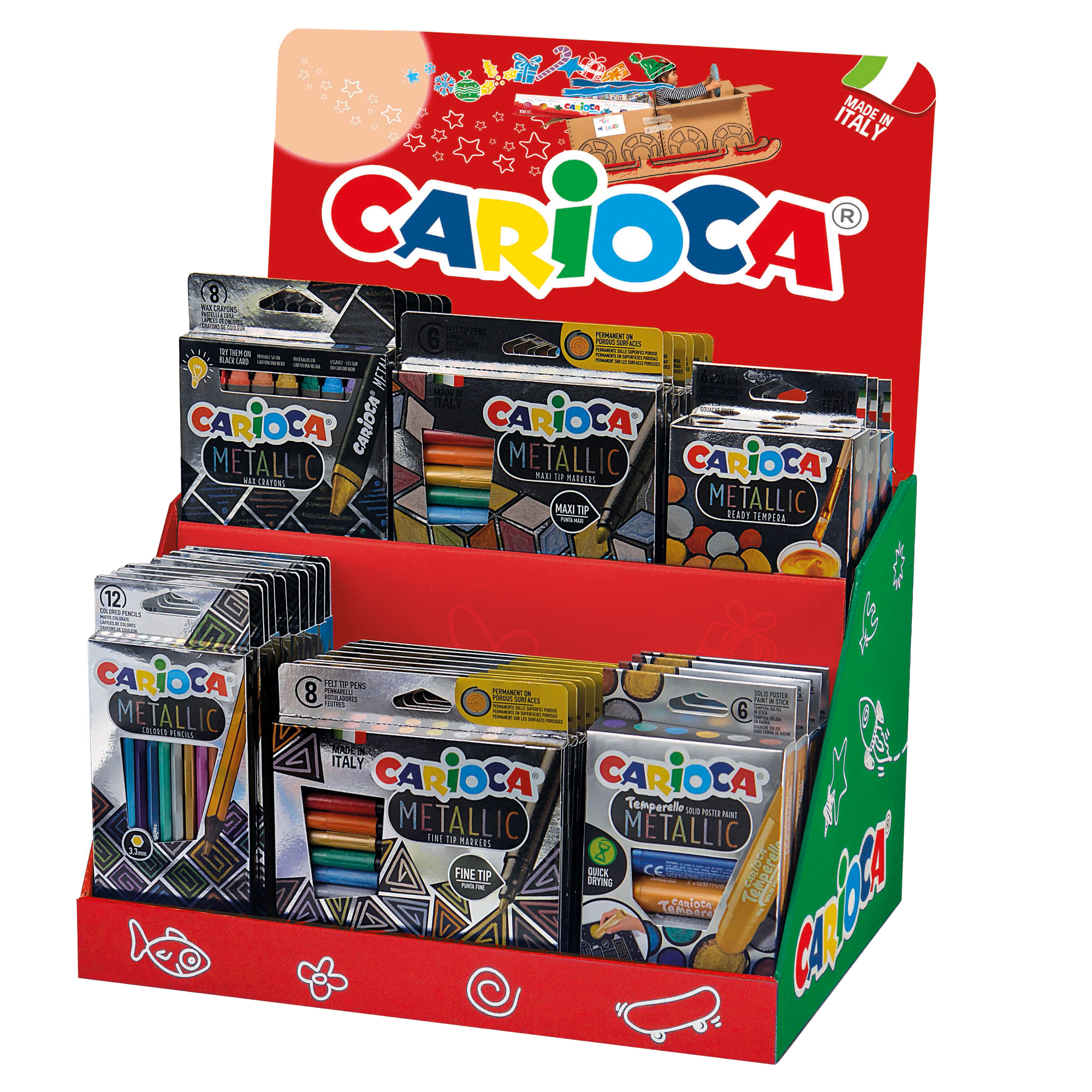 Display da banco contenente: 6 astucci Metallic MaxiMarkers da 6 marcatori, 8 astucci Metallic FineMarker da 8 marcatori, 6 astucci Metallic pastelli a cera da 8 pastelli, 10 astucci Metallic matite da 12 matite, 4 astucci Metallic Temperello da 6 pz e 3 conf. di tempera Metallic da 6 pz 25ml.