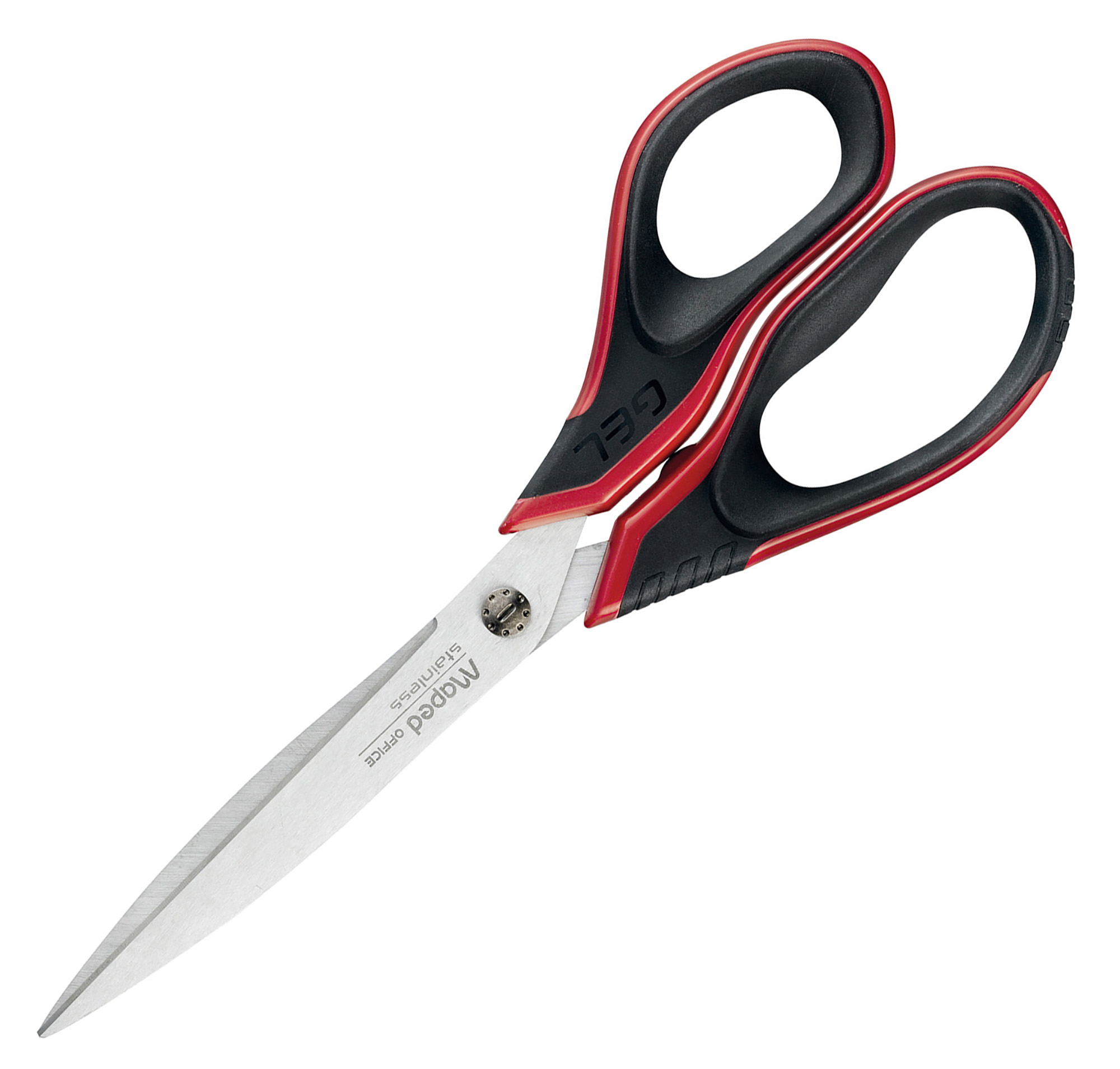 Forbici con lame e rivetto in acciaio inossidabile, anelli ergonomici bi-materiale con nuovo materiale soft gel innovativo.