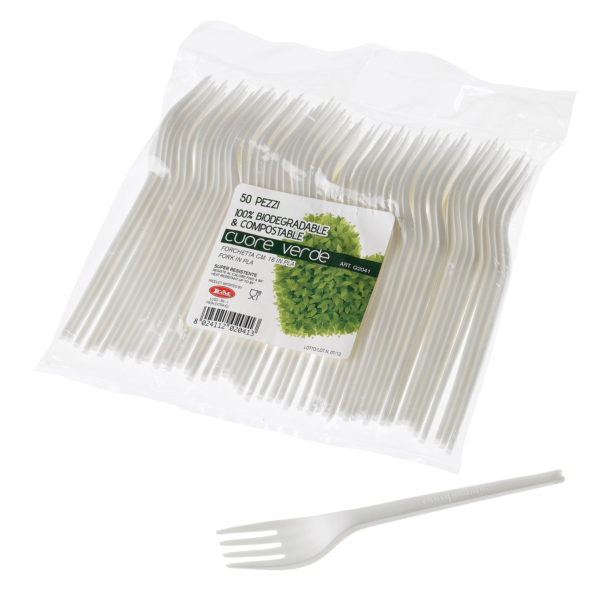CPLA /PLA Cristallizzato (polimero derivato del mais resistente fino a 85°C). Non adatto alla cottura in forno e microonde.Conservare in luogo asciutto e lontano da fonti di calore e raggi del sole.Prodotto non destinato a bambini sotto i 3 anni.